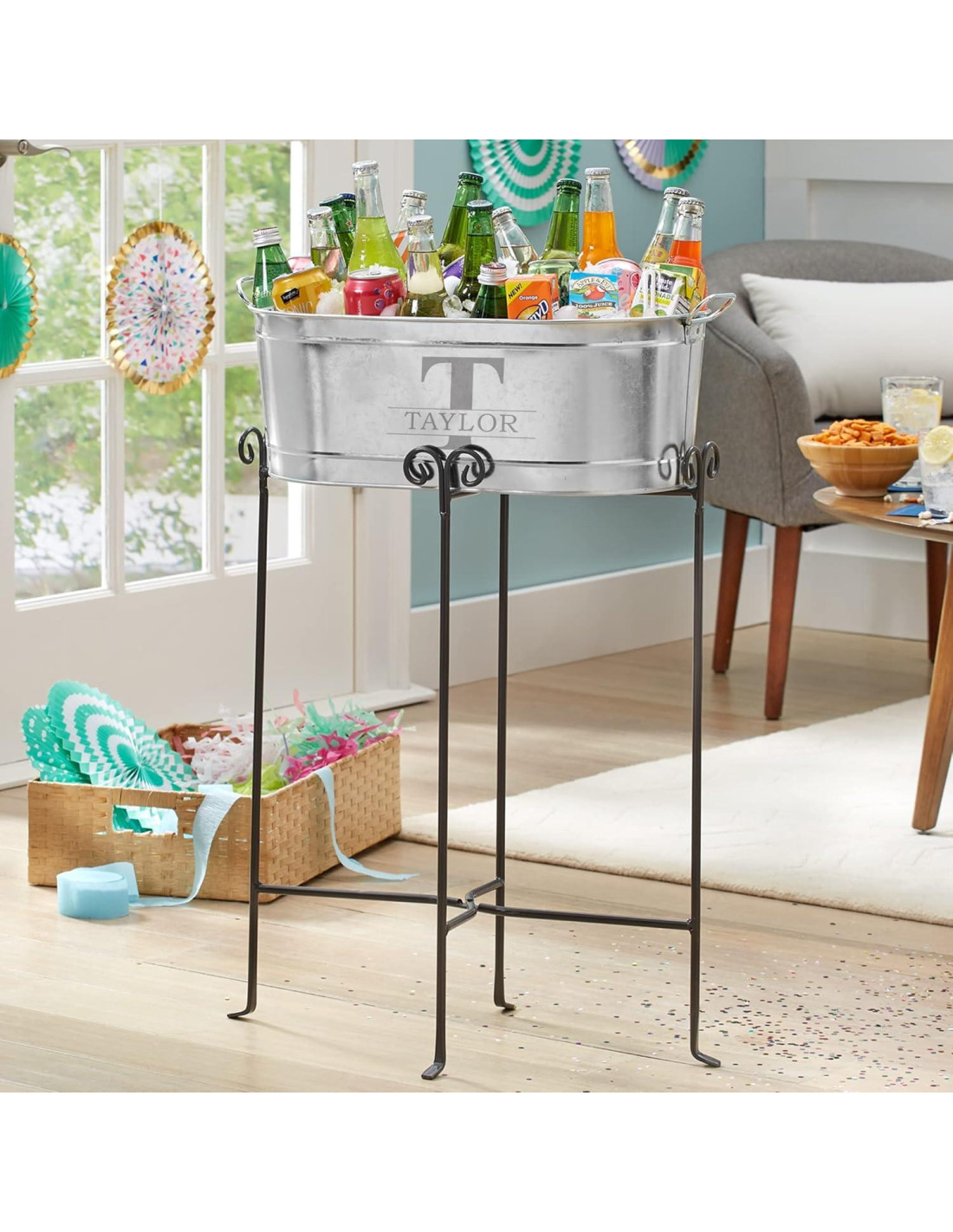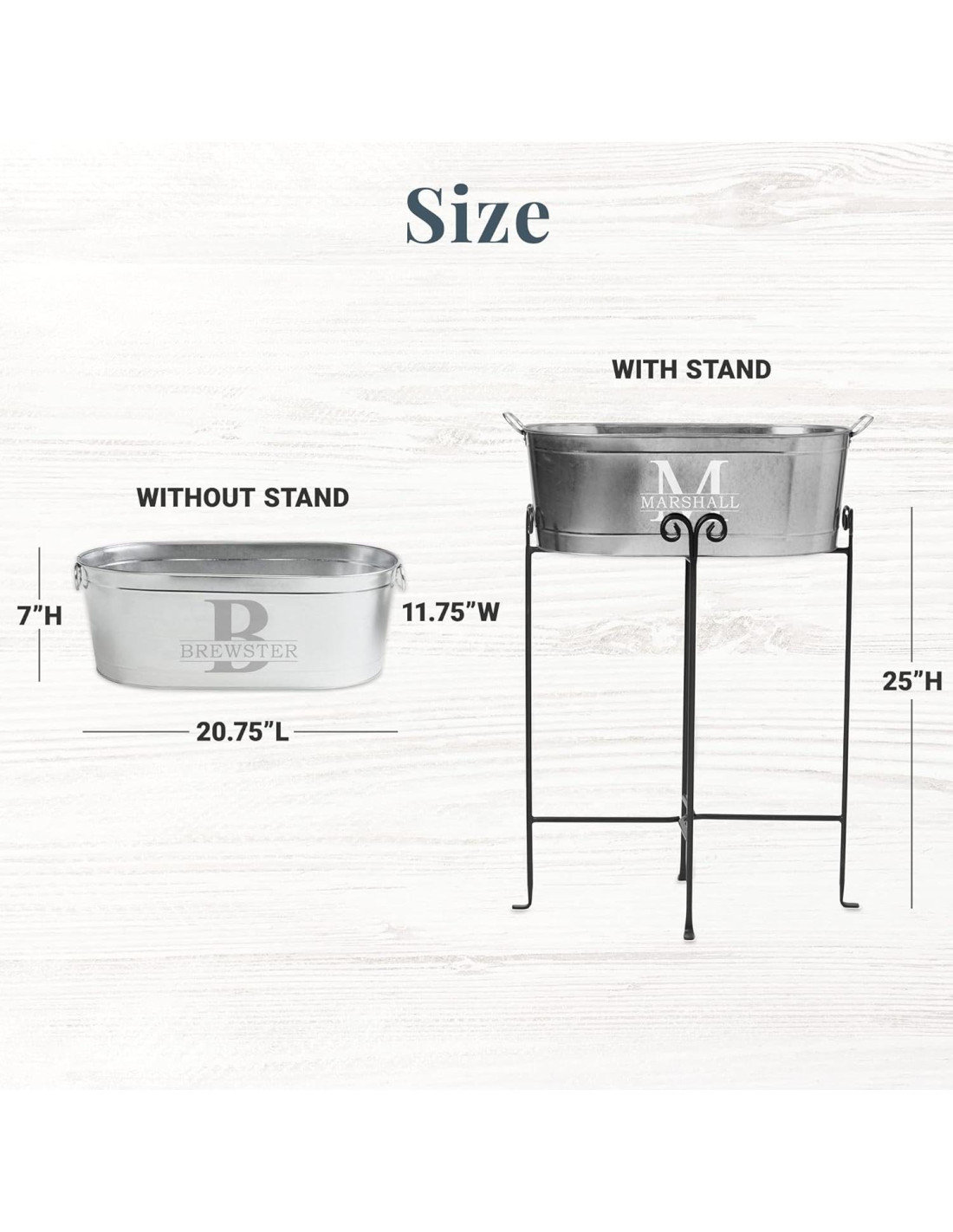 - PERSONALIZADA DE MANERA ÚNICA: ¡Comencemos la celebración! Personaliza esta tina de bebidas con cualquier inicial y nombre de hasta 12 caracteres grabados en ella. El soporte de hierro forjado de 63.5 cm de altura sostiene la tina a una altura de servicio fácil, se pliega para almacenamiento.