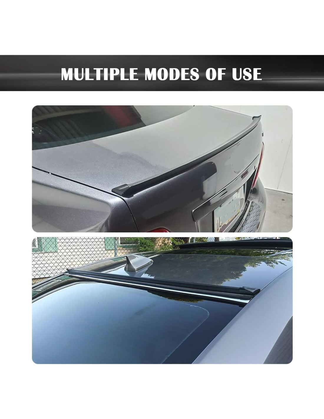 - Modificación personalizada: ¡Haz algunos pequeños cambios en tu coche, que pueden tener efectos inesperados! La inspiración de diseño para nuestro alerón de coche proviene de los coches de carreras geniales. El diseño de carcasa reflectante le da un fuerte sentido de moda y deportividad. El alerón trasero del coche envuelve firmemente la carrocería del coche, ¡haciendo que tu coche sea la presencia más llamativa en el carril!