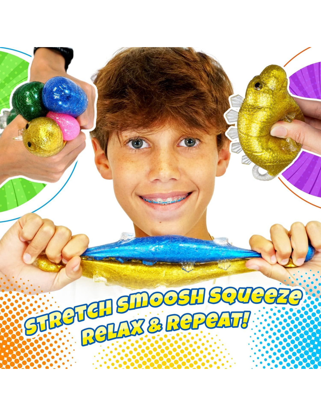 - Paquete de 12 Juguetes de Dinosaurio Squishy con Brillo - El paquete de juguetes antiestrés tiene colores variados (Amarillo, Rosa, Verde, Azul). Juguetes de dinosaurio súper squishy y elásticos para niños. Más 1 Sticker FunaTon.