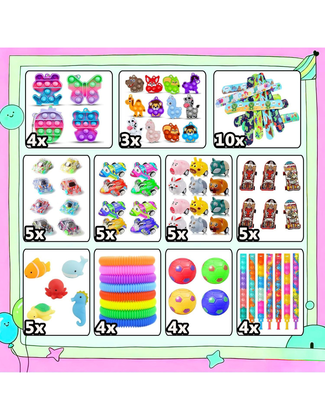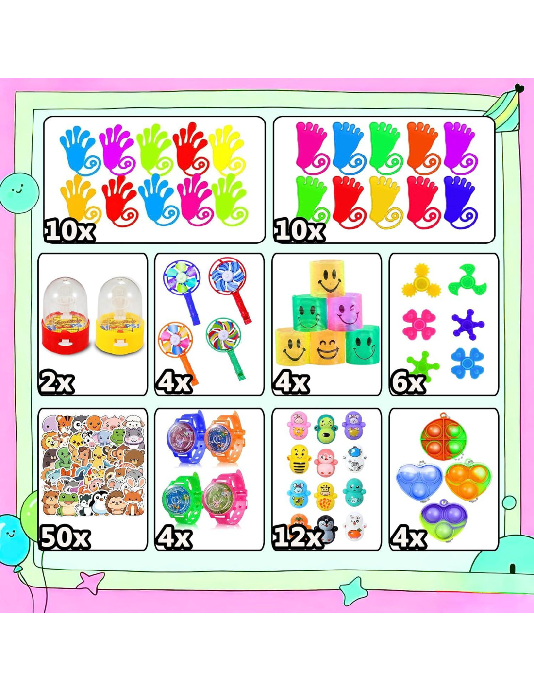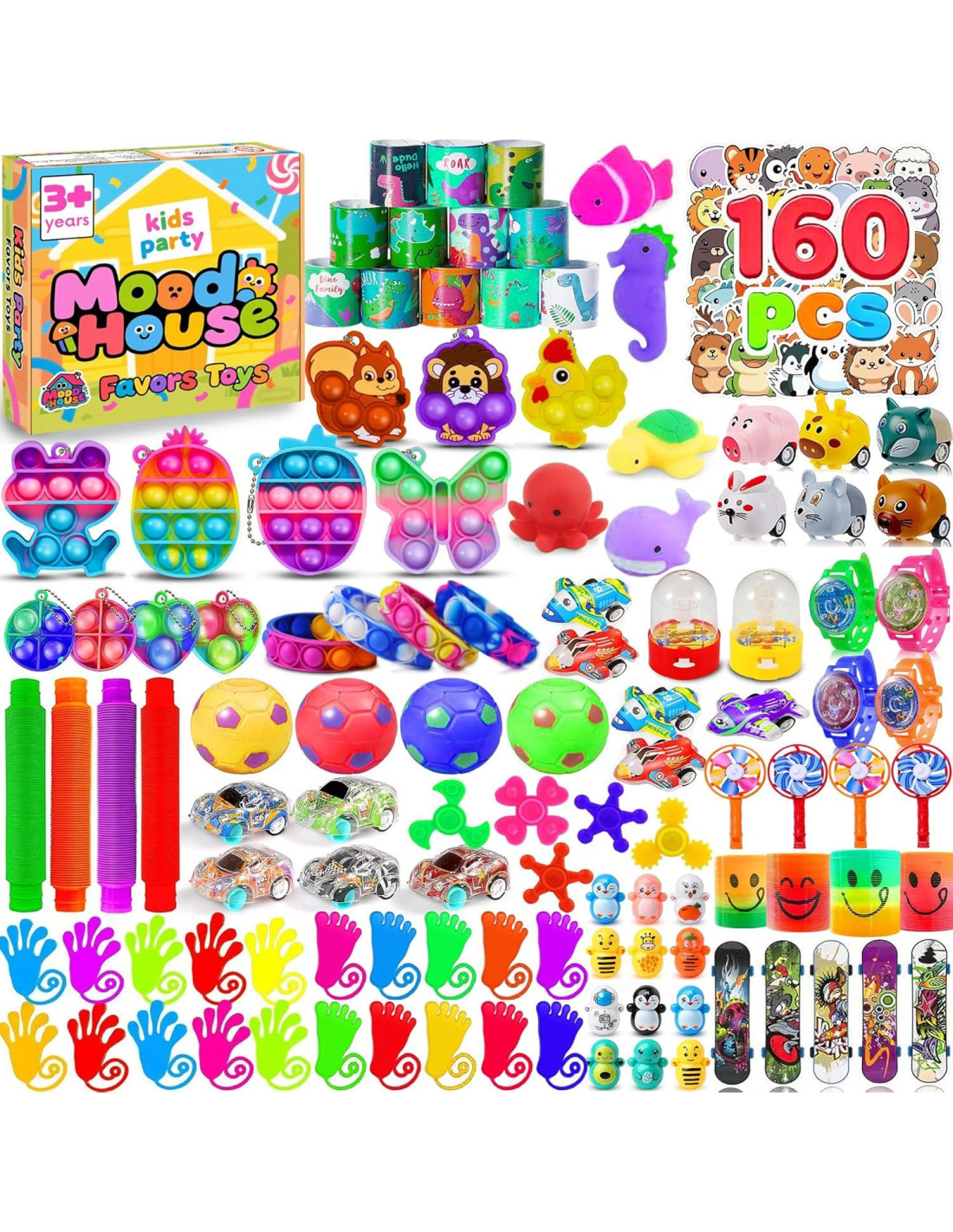 - Paquete de 160 Piezas de Favoritos de Fiesta - 4 pulseras pop, 4 juguetes antiestrés pop, 3 burbujas de animales pop, 4 mini burbujas pop, 5 juguetes squishy, 10 manos pegajosas, 10 suelas pegajosas, 12 juguetes de vaso, 2 lanzadores de baloncesto para dedos, 4 laberintos de reloj, 4 juguetes de mini ventiladores, 4 mini resortes, 5 animales de retroceso, 5 coches de retroceso, 5 aviones de retroceso, 5 patinetas mini, 10 pulseras de golpe, 50 pegatinas, 4 tubos pop, 6 mini spinners antiestrés, y 4 spinners antiestrés de fútbol