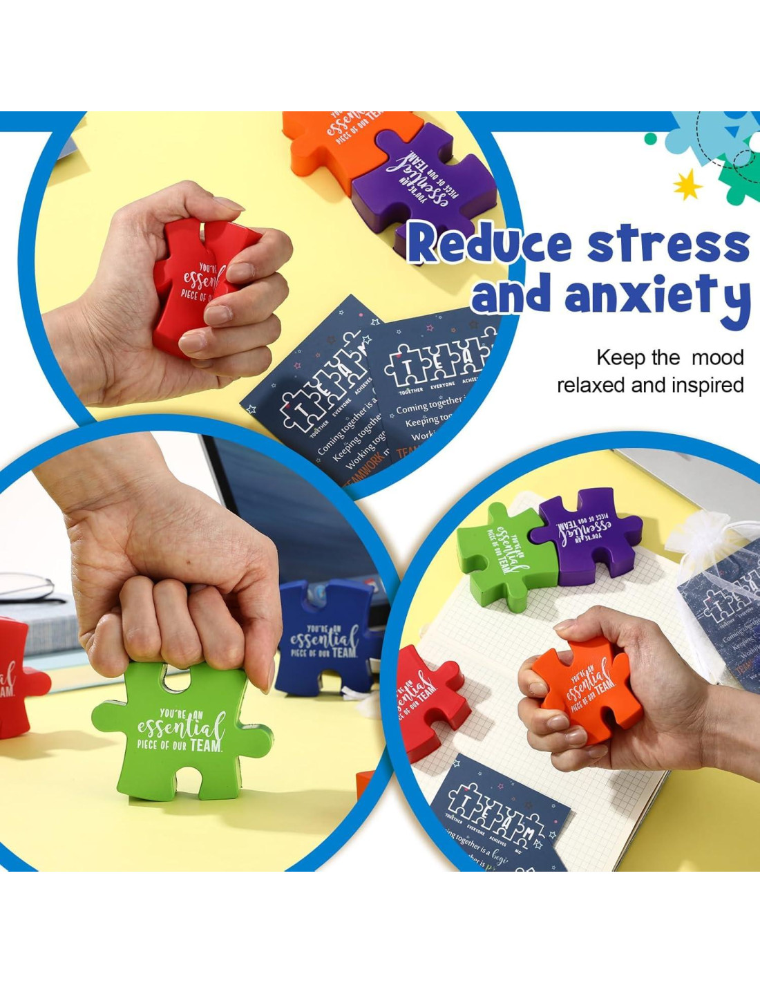 - Regalo de Apreciación para el Equipo: las pelotas de estrés inspiradoras para el equipo con tarjetas motivacionales ofrecen una experiencia edificante; Cada pelota de apretar presenta palabras motivadoras, complementadas por mensajes de trabajo en equipo en las tarjetas, creando un regalo de apreciación para el equipo inspirador