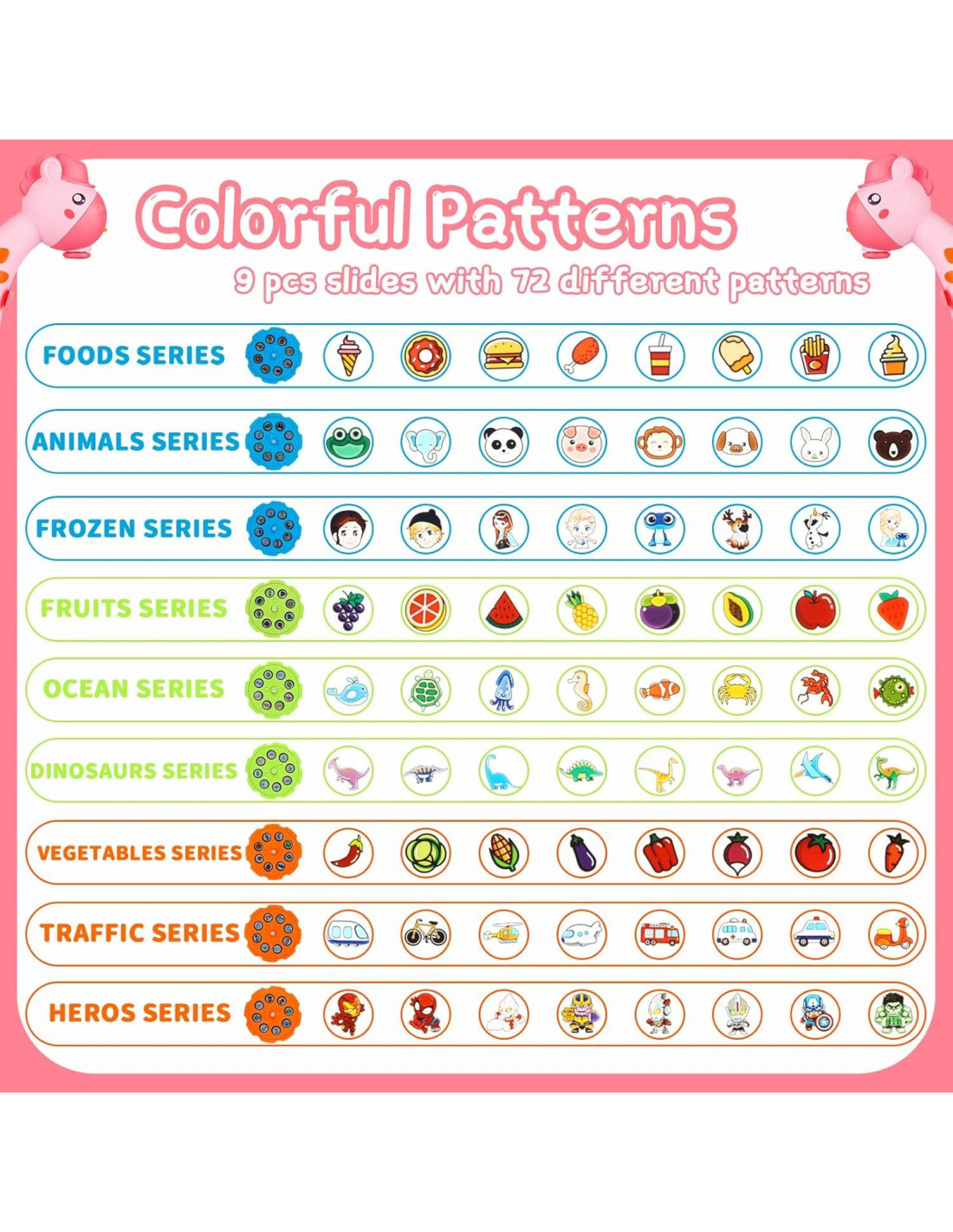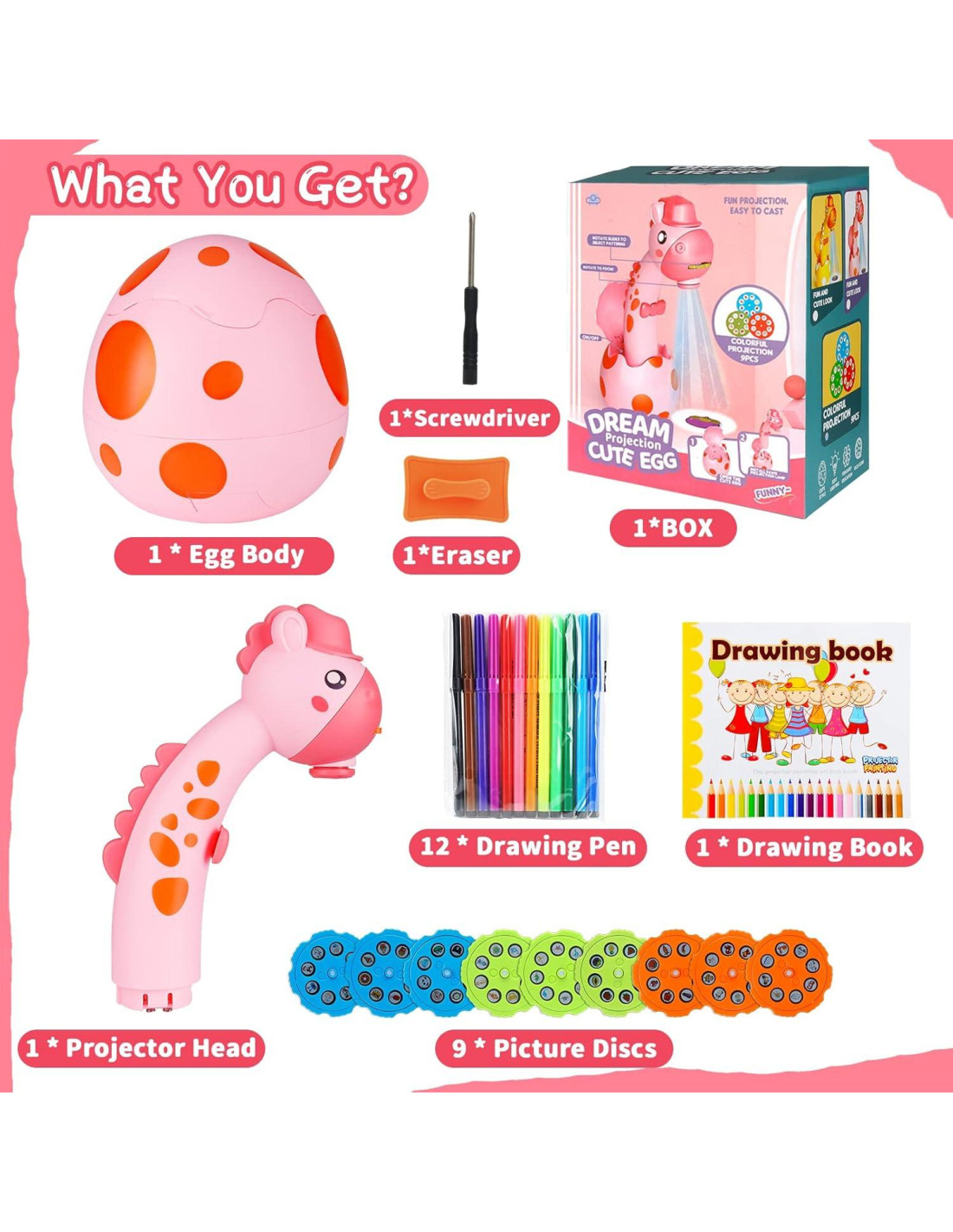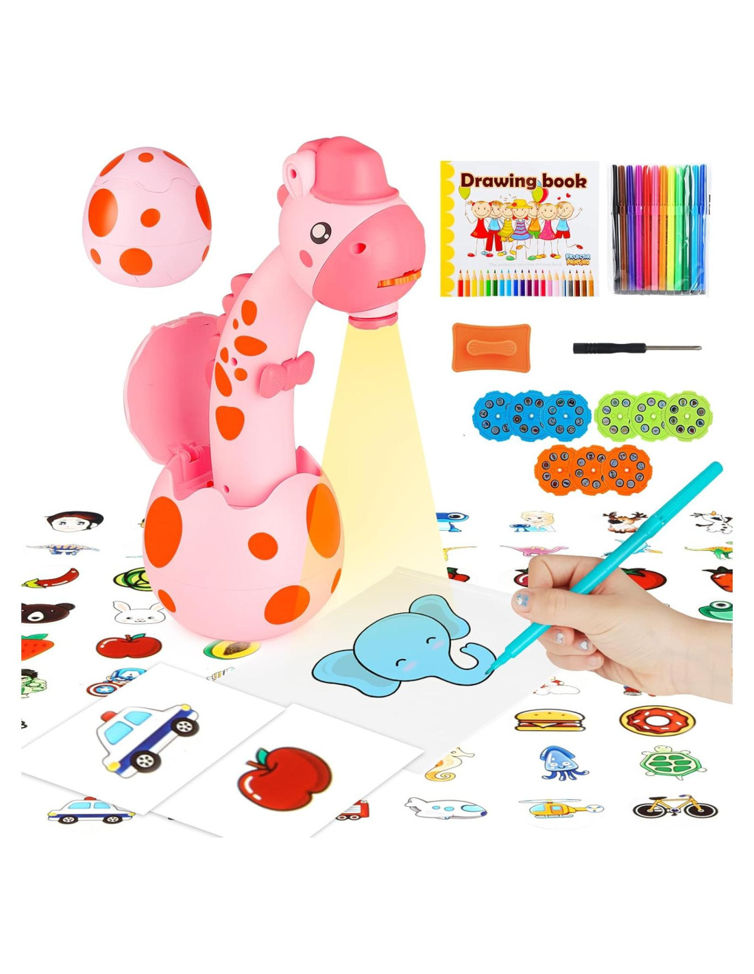 - [Lo Que Obtienes] El conjunto de proyector de dibujo contiene un Proyector de Dibujo x 1, un libro de dibujo x 1, 12 Lápices de Dibujo, 9 Discos y una herramienta borrable x 1. El lindo diseño en forma de huevo lo hace portátil. Tus hijos pueden llevarlo a donde quieran, un buen compañero de viaje para niños de 3 años en adelante.