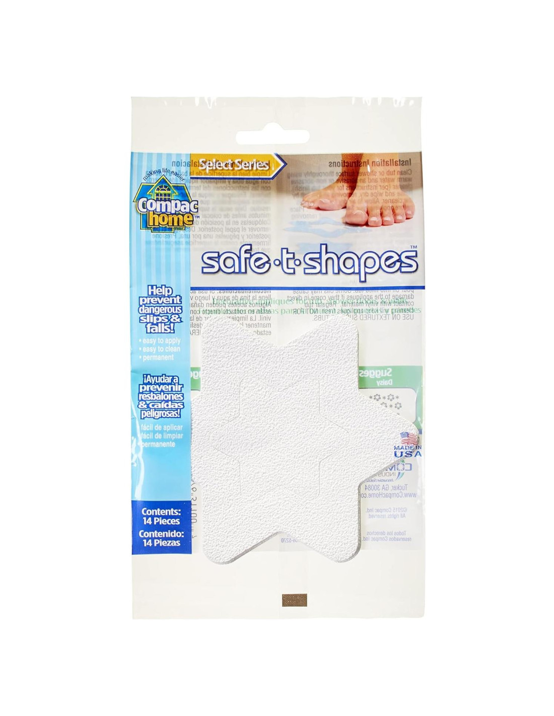 Los Safe T de Compac son stickers antideslizantes para ducha, en forma de estrella que mantienen a ti y a tu familia, amigos e incluso mascotas, seguros de resbalones en la bañera o ducha u otras superficies resbaladizas, como escaleras y terrazas. Fáciles de aplicar y divertidos de organizar, solo quita la parte adhesiva, colócalos en una superficie limpia y presiona firmemente. Las formas Safe T tienen una superficie texturizada que mantiene tus pies seguros y sin resbalones. La aplicación es permanente, lo que significa que no se desgastarán con el uso ni se despegarán, y las formas Safe T tienen un diseño atractivo que aporta una decoración de buen gusto mientras proporcionan la estabilidad que necesitas en superficies resbaladizas al mismo tiempo. Las formas Safe T son perfectas para tu bañera o ducha; sin embargo, no son para usar en superficies ya texturizadas. Limpiar tu bañera o ducha como de costumbre ayudará a mantener las formas Safe T frescas y con buen aspecto; no se requieren prácticas de limpieza especiales. Al usar aceites de baño, vierte el aceite en una bañera llena, porque el contacto directo con el aceite puede dañar las formas.