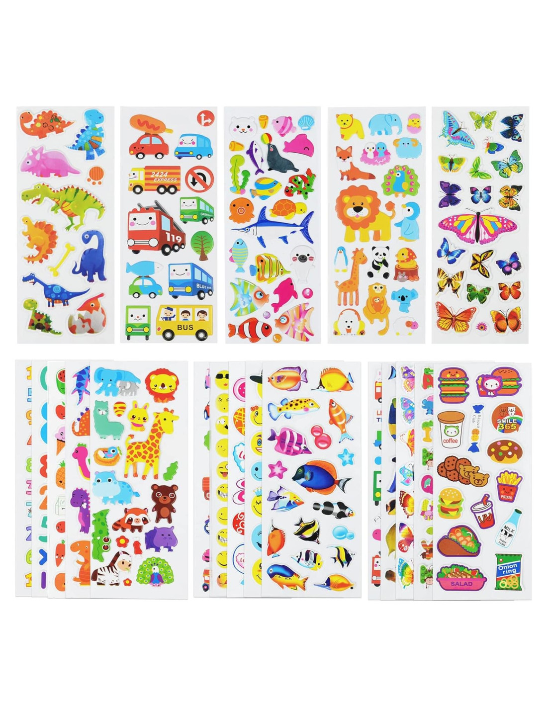 - Paquete Variado: 19.6 cm x 7.1 cm por hoja. Cada paquete incluye 24 hojas diferentes, cada hoja viene en paquetes claros individuales, sin repeticiones de diseños. Los stickers para niños son esponjosos, diseños súper lindos, colores bonitos, Estos stickers divertidos incluyen: animales, frutas, dinosaurios, peces, números, coches, mariposas, etc.