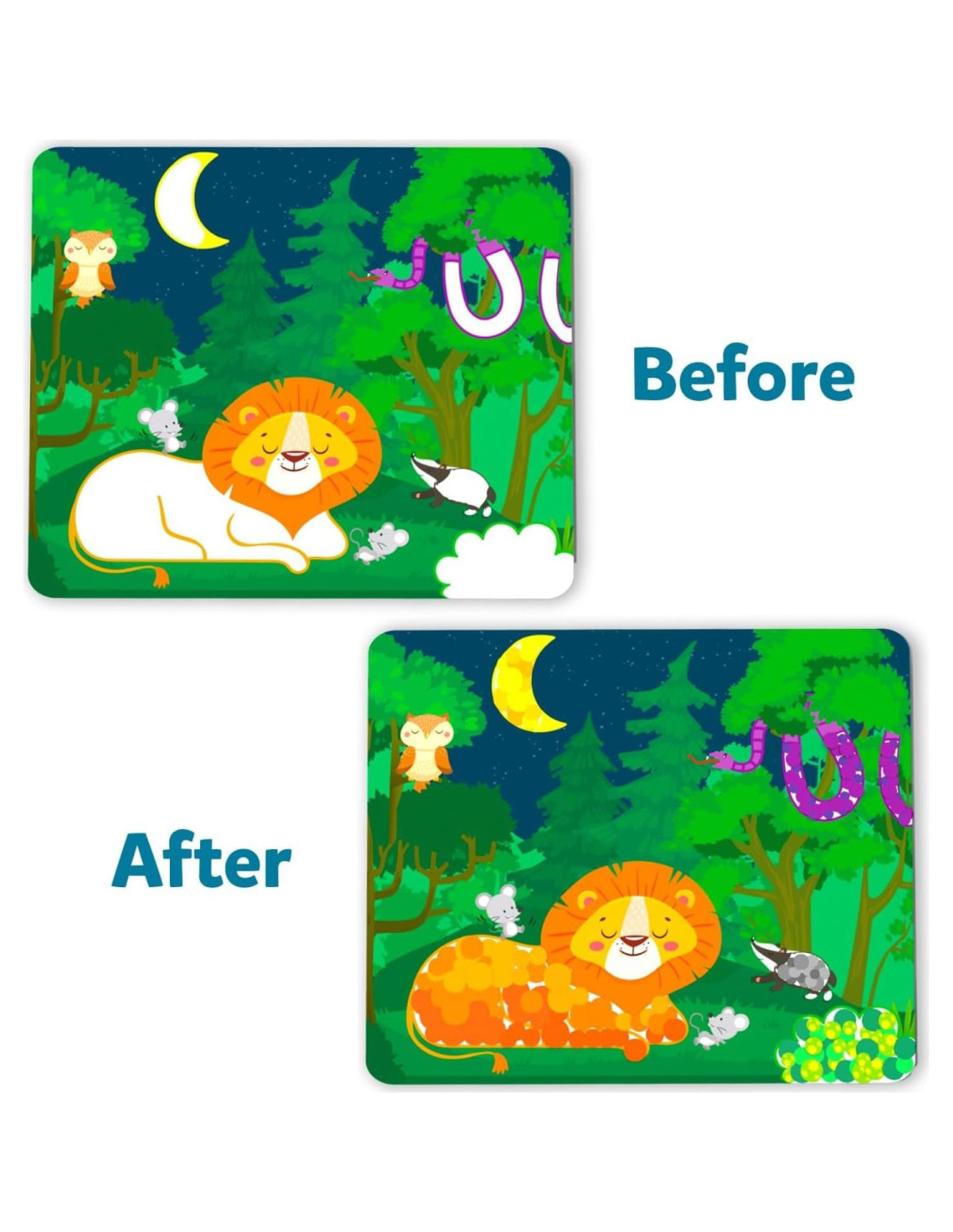 - CÓMO USAR: Deja que tu hijo elija sus stickers de colores favoritos, los despegue y los pegue en los lienzos para dar vida a la imagen.