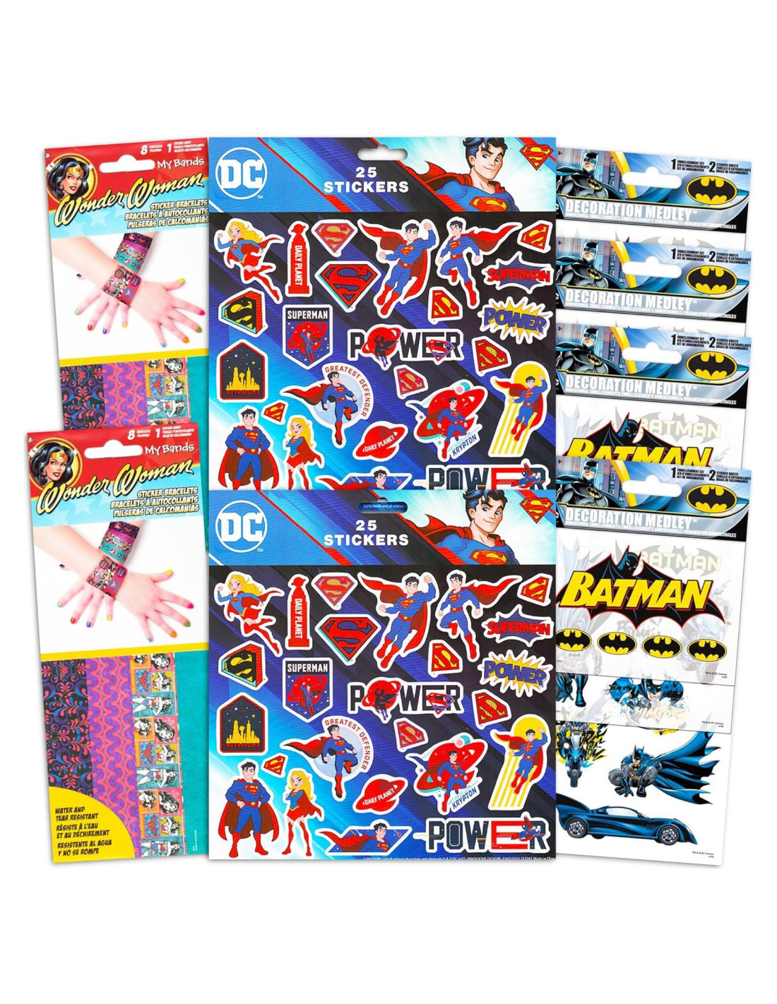 Paquete de Suministros para Fiesta de Stickers de Superman de DC Comics ~ Paquete Variado de Stickers de Superman y la Liga de la Justicia. Más de 50 stickers coloridos de Superman que presentan tanto al Hombre de Acero como al Caballero Oscuro, Batman. Estos stickers son una gran adición a cualquier fiesta de cumpleaños temática de Superman o álbum de recortes. Reparte como recuerdos de fiesta de Superman en fiestas de cumpleaños o como stickers de recompensa, stickers motivacionales y más. Este set también incluye 50 stickers de Batman y 50 stickers de Wonder Woman. Los stickers coloridos de Superman presentan muchos diseños diferentes. Úsalos en ventanas, paredes, libros y otras decoraciones de la Liga de la Justicia. Productos de juguetes y juegos de Superman oficialmente licenciados, para niños y niñas por igual.
