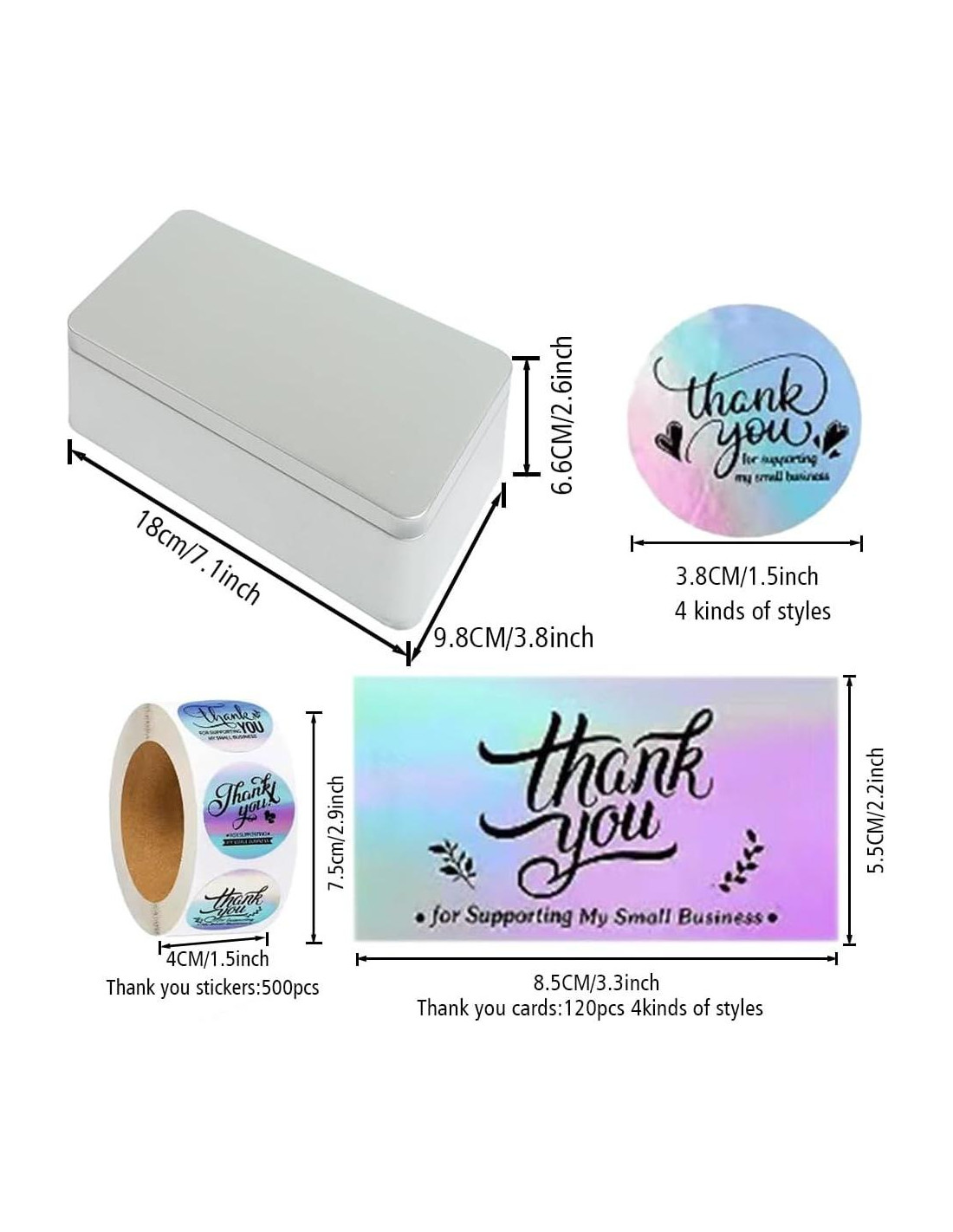 - El paquete incluye: 120 tarjetas (3.5in (8.89cm) x 2in (5.08cm)) con cuatro diseños diferentes, cada una expresando gratitud por apoyar mi pequeño negocio. También viene con un rollo de stickers de etiqueta de agradecimiento de 1.5in (3.81cm) (500 stickers por rollo), todo almacenado en una caja de metal sellable, que es el tamaño perfecto para almacenar tarjetas, sobres, cajas de regalo, botellas y más. Con una cantidad tan generosa, es ideal para satisfacer las necesidades de tu pequeño negocio.