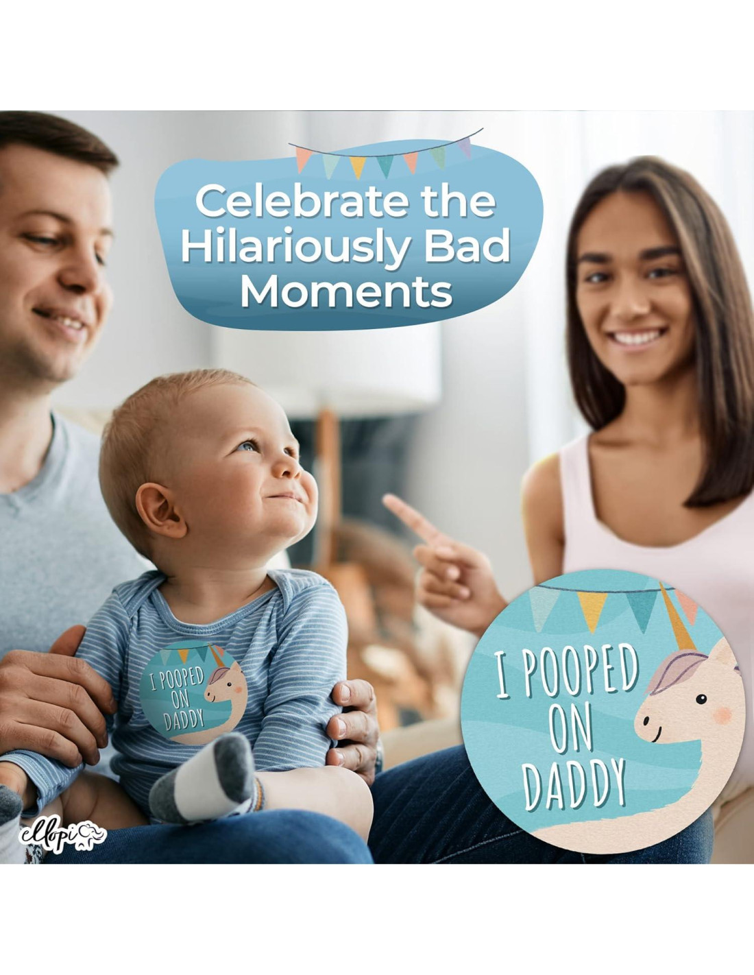 - UN REGALO QUE CAUSARÁ RISA DESDE EL BABY SHOWER. Todos se reirán mientras pasas estas pegatinas en el baby shower, y lo más importante, los nuevos padres podrán tener un divertido y duradero registro fotográfico de cuando su hijo hizo popó por primera vez en su papá, mordió a un extraño y muchos más.