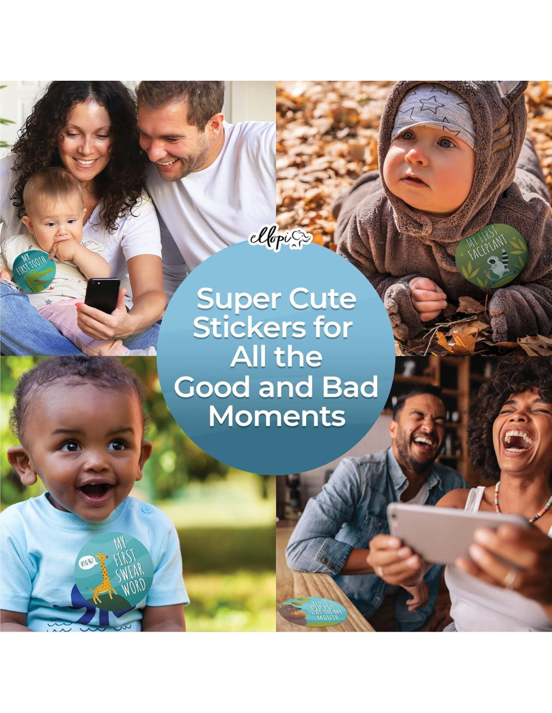 El Regalo Perfecto para Baby Shower Las adorables y divertidas calcomanías de hitos para bebés de Ellopi seguramente sacarán una risa a todos en el baby shower Y serán un gran accesorio fotográfico para cualquier imagen de bebé que los nuevos padres estén tomando. Les estarás dando las adorables pegatinas de "recién nacido" y de hitos mensuales, así como pegatinas para los momentos frustrantemente divertidos como "Hice Popó en Papá", "Primer Caída", y muchos más. ¿Qué padres no querrían tener una foto conmemorativa del "Primer Escape de Pañal en Público" de su hijo para mostrar a amigos y familiares una vez que ese niño sea un adolescente? Las pegatinas reutilizables se pueden quitar fácilmente de la ropa. Las nuevas mamás y papás pueden simplemente quitar las pegatinas del respaldo y colocarlas directamente en el body, camiseta, vestido, etc. ¡Los accesorios fotográficos se pueden quitar fácilmente para usarlos de nuevo! Pegatinas brillantes y divertidas son perfectas para redes sociales y álbumes de recortes. Las pegatinas brillantes en azul y verde ayudarán a crear visuales digitales divertidos para tus seguidores de Facebook, TikTok e Instagram y se verán geniales en un álbum de recortes usando una versión impresa de la foto. ¡El acabado mate ayuda a prevenir el deslumbramiento para asegurarte de que tengas las mejores fotos posibles! Diseños de adorables animales para tu bebé recién nacido. Siguiendo con el tema de bebés; las madres, padres y abuelos adorarán los adorables diseños de animales en cada pegatina. Desde un cervatillo dando sus primeros pasos, hasta una jirafa bebé diciendo sus primeras groserías, te tenemos cubierto. ¿Qué hay en la caja? Recibirás 30 pegatinas redondas de 4 pulgadas - pegatinas mensuales para 1-12, una pegatina de recién nacido, 4 pegatinas de buenos momentos y 12 pegatinas de experiencias divertidas, y 1 pegatina en blanco para llenar como desees. ¡Satisfacción Asegurada de por Vida! Si no estás completamente satisfecho con tu pedido, simplemente envíanos un correo electrónico, y responderemos dentro de 24 horas para solucionarlo incluso los fines de semana. ¡Aseguramos tu satisfacción al 100%!