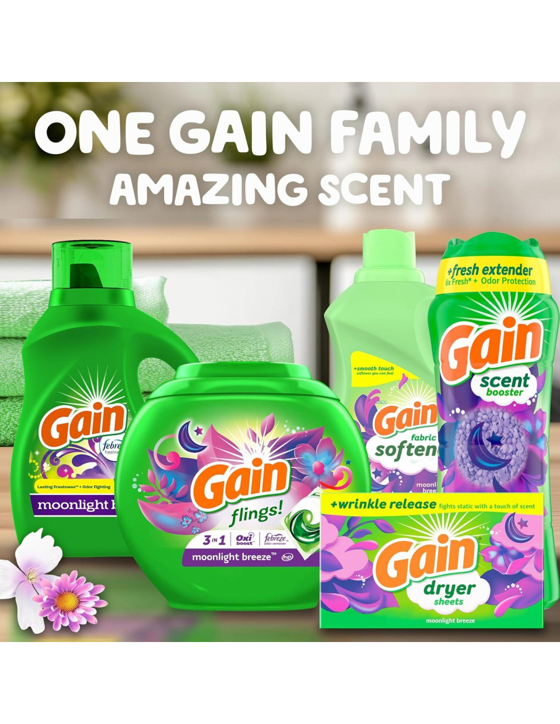 - Lava tu ropa con fragancias a juego en el Detergente para Ropa Gain, Suavizante de Tela Líquido y Perlas Aumentadoras de Fragancia, luego añade hojas de secadora a la secadora para mantener tu ropa oliendo increíble incluso después de seis semanas
