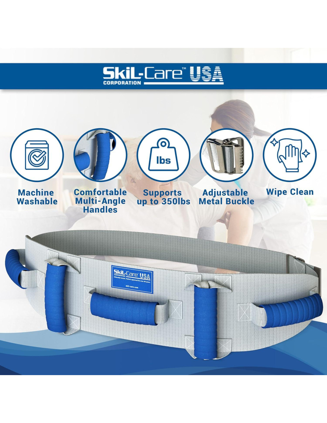 - Asas Multi-Grip para mejor control: Cuenta con cinco asas suaves y acolchadas colocadas alrededor del cinturón de marcha para dar a los cuidadores un agarre ergonómico desde múltiples ángulos, mejorando el control durante la asistencia de elevación y el soporte de marcha.