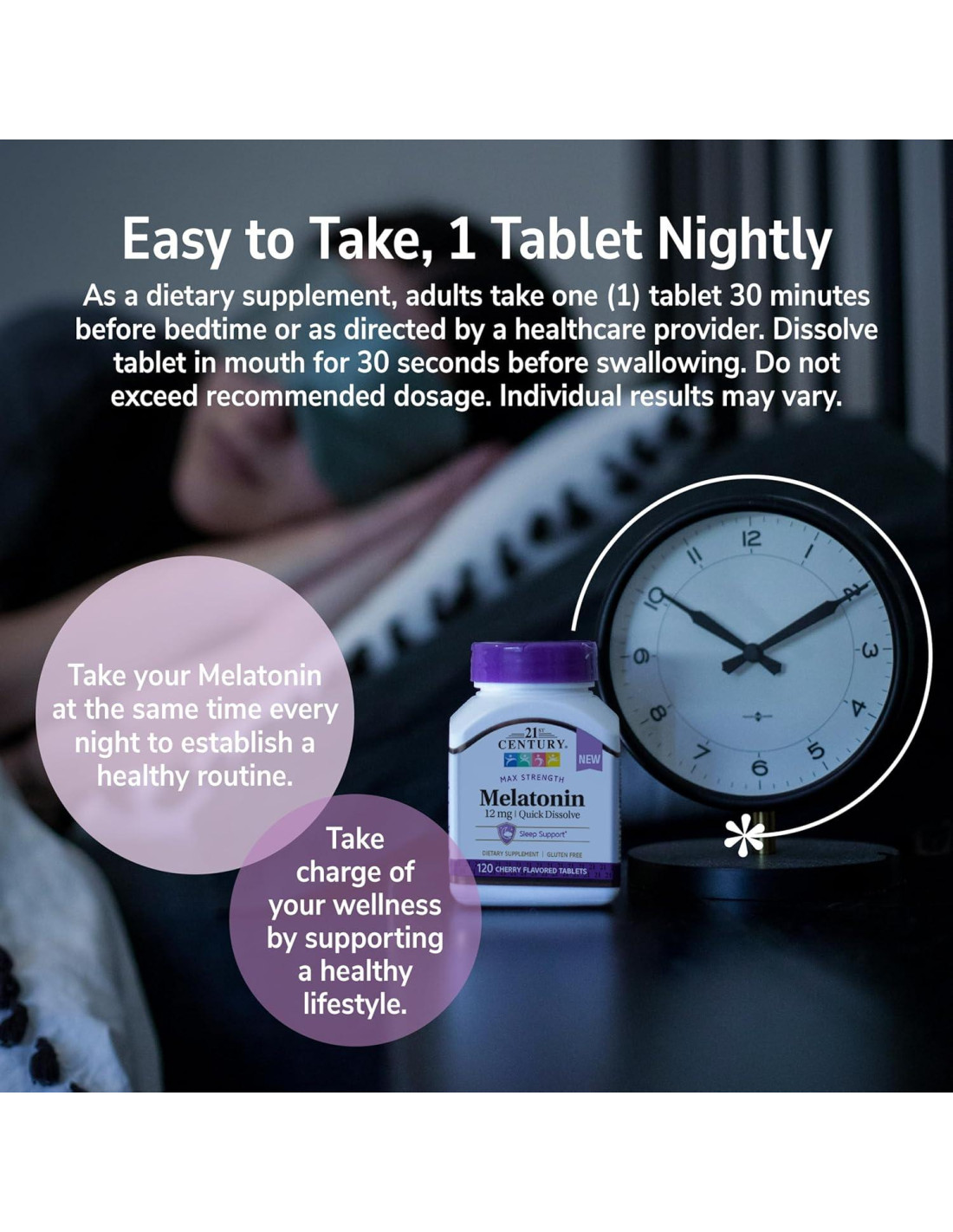- AYUDA PARA DORMIR DE MÁXIMA POTENCIA: La melatonina ayuda a mantener nuestros ciclos de sueño/vigilia, desempeñando un papel crucial en la promoción de un sueño reparador. La melatonina del siglo 21 12 mg ayuda a las personas con insomnio ocasional a conciliar el sueño más rápido y disfrutar de un sueño más reparador.