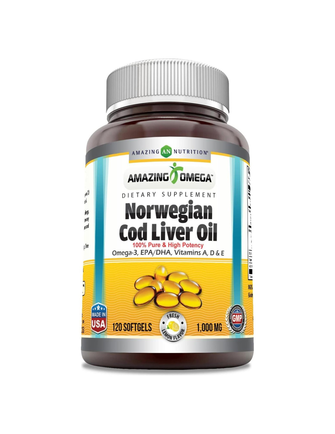 Aceite de Hígado de Bacalao Noruego Amazing Omega 1000 Mg Suplemento de Cápsulas Blandas | Omega-3, EPA, DHA, Vitamina A, Vitamina D & Vitamina E (Limón, 120 Unidades)