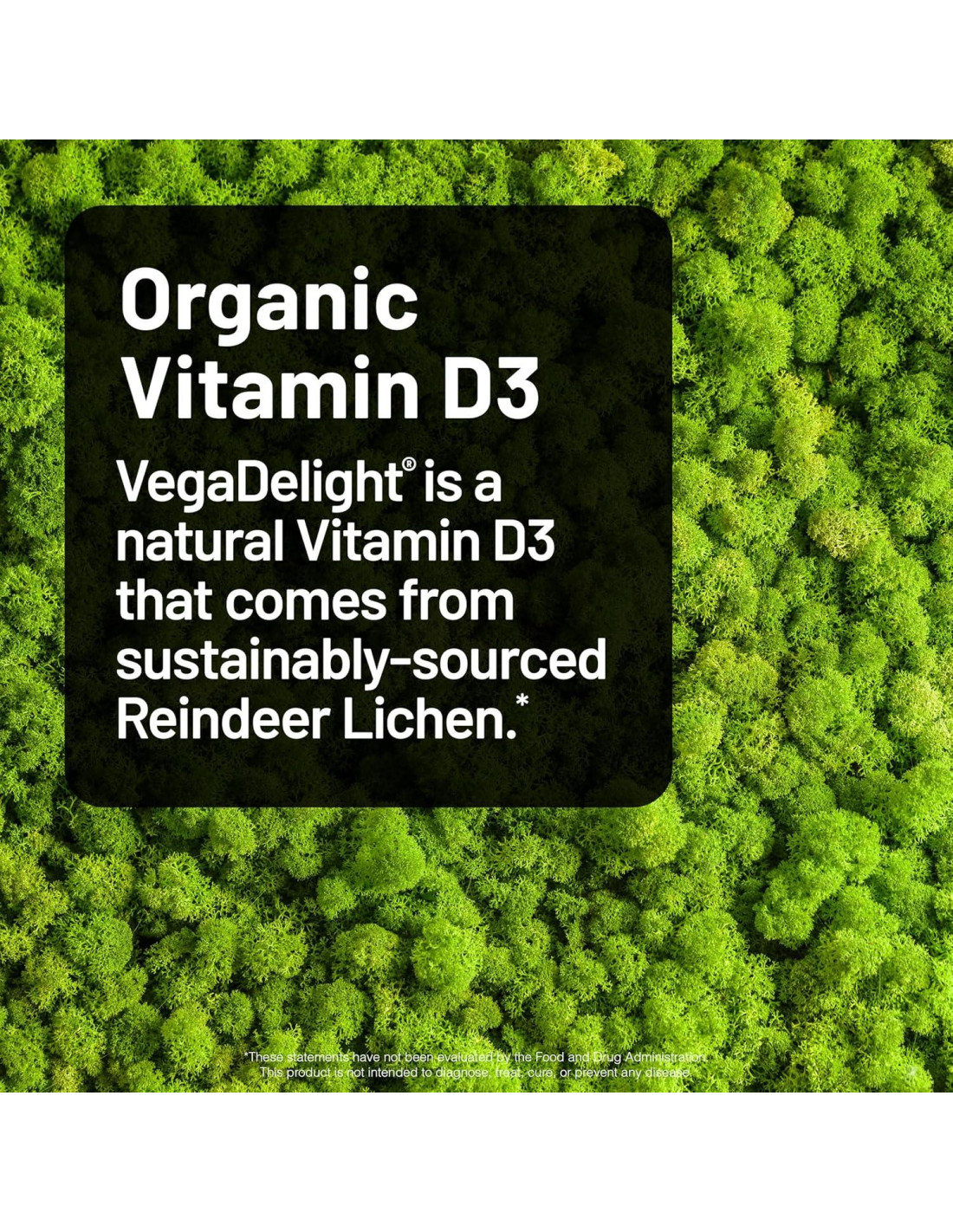 - VITAMINA D3 VEGANA ORGÁNICA: Nuestra Vitamina D3 Vegana es de VegaDelight, una D3 orgánica de líquenes de origen sostenible, una alga que produce una vitamina D3 natural, vegana y biodisponible.