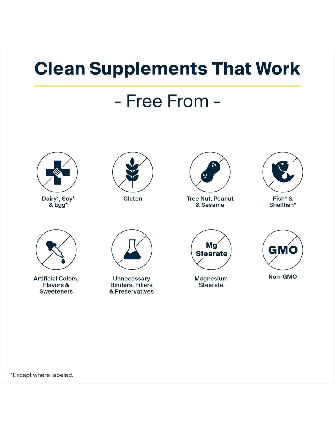 - Fórmula Limpia: Libre de gluten, lácteos, cacahuetes, nueces, sésamo y huevo. No OGM. Hecho sin rellenos, recubrimientos, aglutinantes o colores artificiales