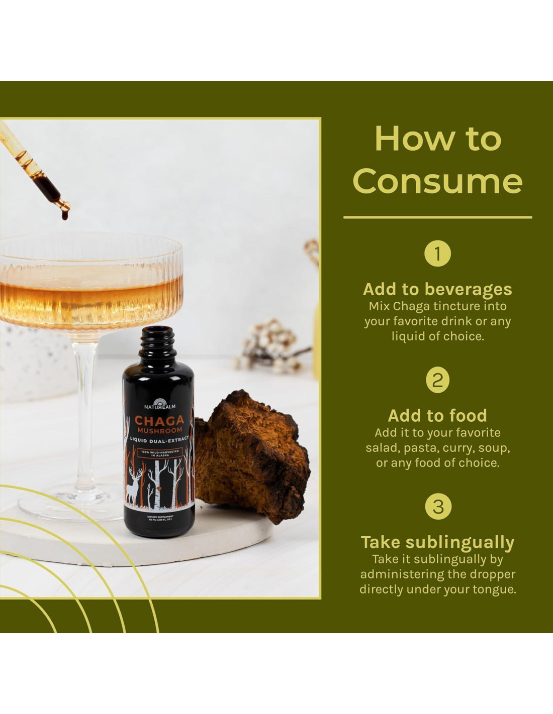 - Extracto Potente de Hongo Chaga: Los recolectores en y nativos de Alaska Central envían Chaga de alta calidad y 100 por ciento de hongo recién molido a una instalación certificada por GMP para su procesamiento y tinturación natural. La extracción del polvo de hongo Chaga molido incluye remojar los restos en alcohol de caña orgánico durante 30 días para la primera extracción. Para la segunda extracción, los restos se cocinan a fuego lento en agua caliente durante 24 horas. La combinación de estas soluciones crea la Tintura de Hongo Chaga.