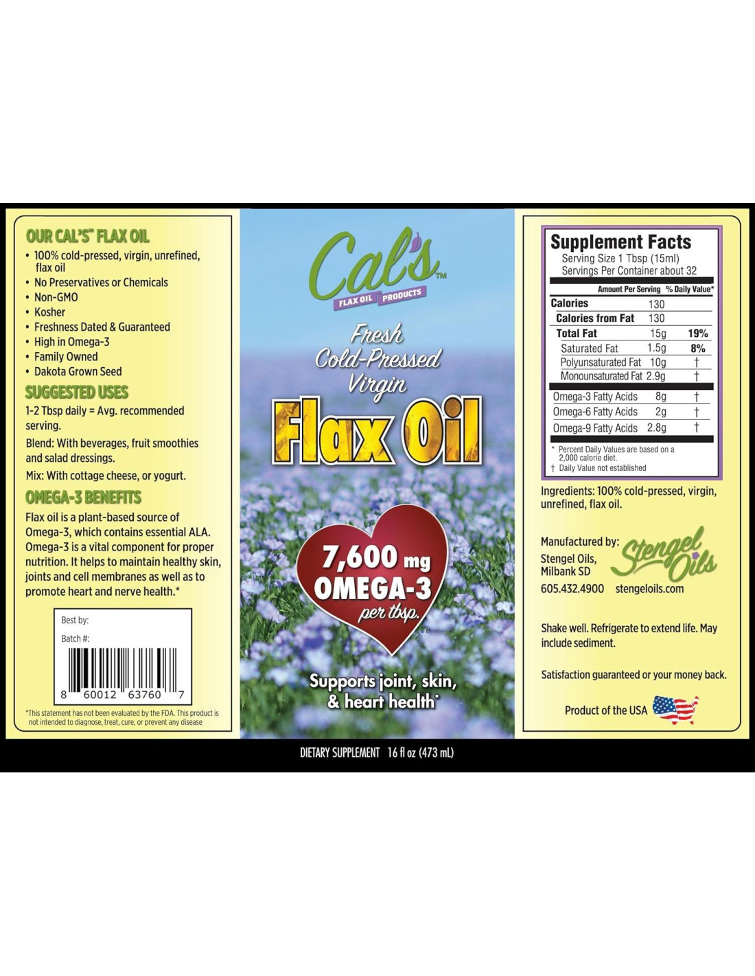 - La garantía de Cal de producción superior "Prensado en Frío Verdadero" para prevenir la oxidación y preservar los beneficios para la salud tal como la naturaleza lo pretendía. Alto en ácido graso ALA Omega-3 (7,600 mg por cucharada).