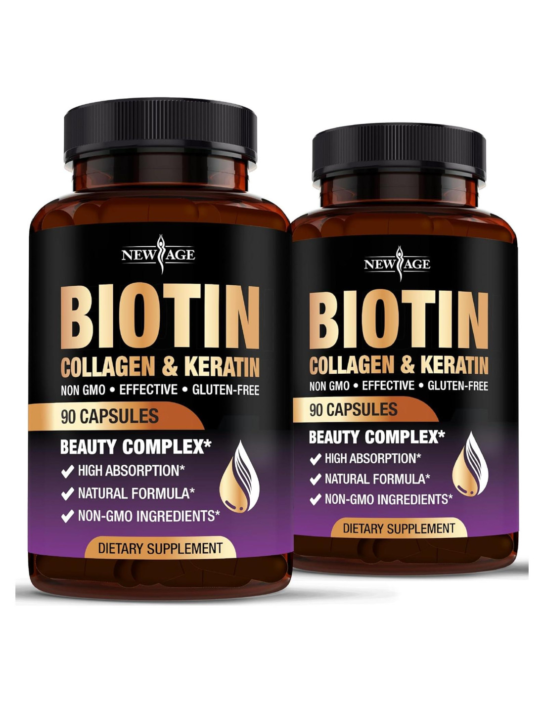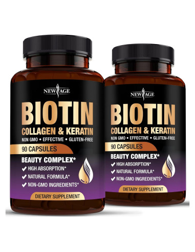 - Biotina con Ácido Hialurónico, Suplemento de Colágeno y Queratina - Nueva Era mezcla de belleza todo en 1 contiene biotina, colágeno, queratina y otros nutrientes esenciales que apoyan naturalmente tu salud y belleza. Nuestra biotina 10000mcg para mujeres y hombres trabaja para nutrir tu cabello, piel y uñas para disminuir los signos de envejecimiento al fortalecer tu cuerpo con antioxidantes esenciales.