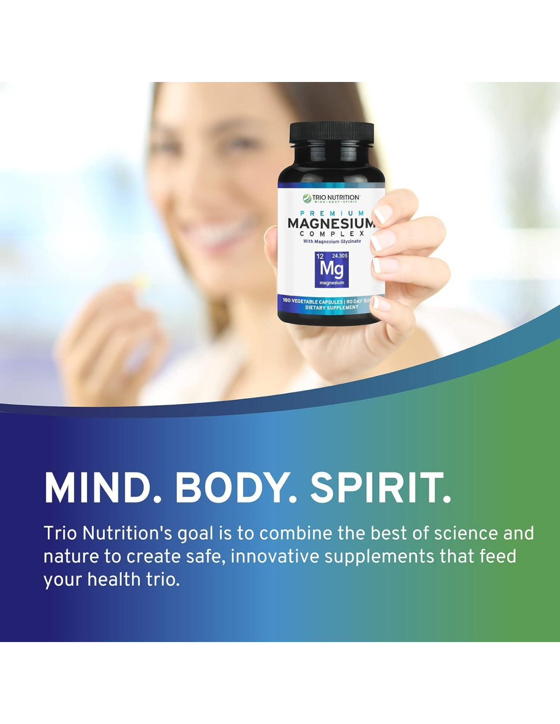 - Cápsulas de Complejo de Magnesio Puro: El suplemento de Complejo de Magnesio de Trio Nutrition con Vitamina B6 proporciona 420 mg de magnesio elemental natural puro en una conveniente porción de 2 cápsulas. Estas cápsulas vegetales están libres de alérgenos importantes y no contienen: lácteos, huevos, pescado, crustáceos, nueces de árbol, mariscos, cacahuetes, trigo o soja.