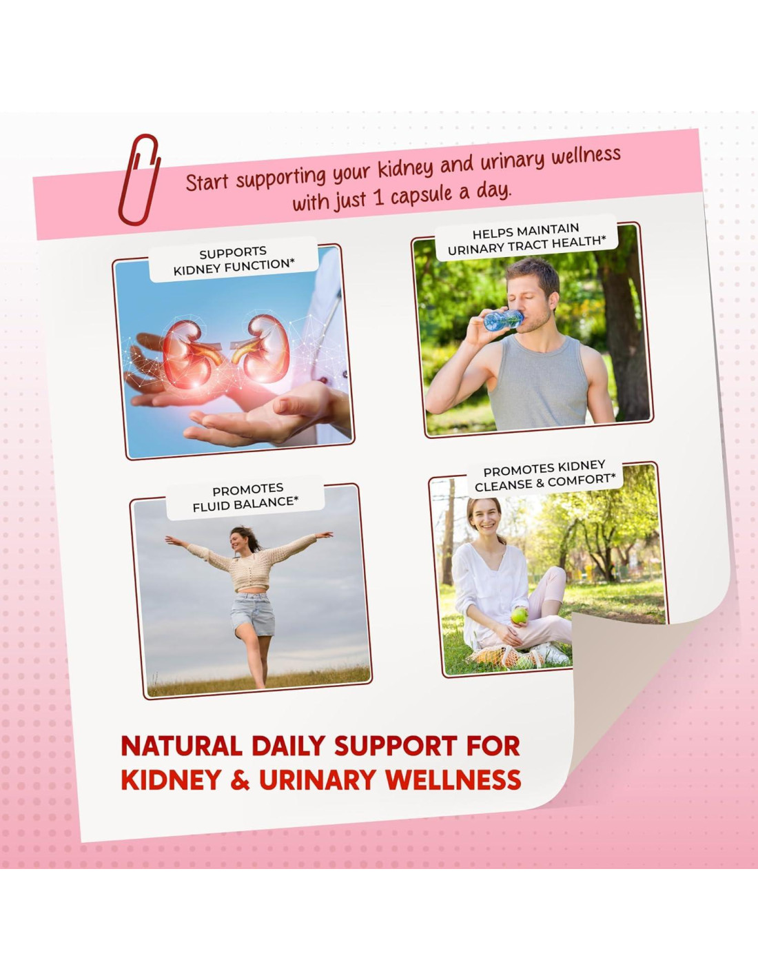 - Soporte Integral para la Salud de Riñones y Urinaria: Formulado con una mezcla de ingredientes naturales como Arándano, Uva Ursi, Diente de León y otros, este suplemento apoya la función renal general y la salud del tracto urinario