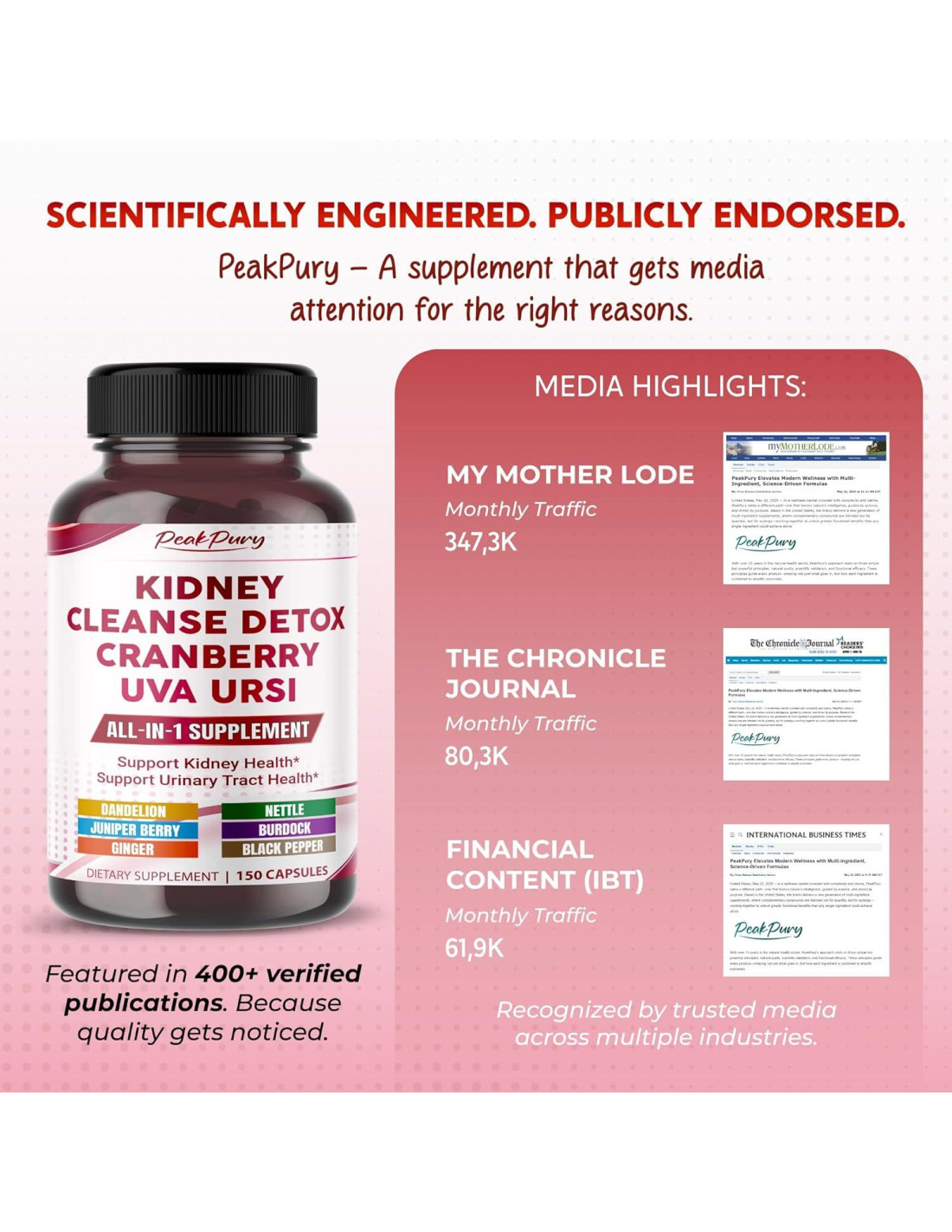 PeakPury mezcla Arándano, Uva Ursi, Ortiga y Diente de León para apoyar la función renal normal y la protección antioxidante - cuidado suave a base de plantas para uso diario. Arándano más Enebro y Uva Ursi ayudan a mantener la limpieza del tracto urinario y promueven un flujo cómodo, para que te sientas a gusto todo el día. El suplemento PeakPury combina Diente de León, Ortiga y Enebro para ayudar a gestionar el equilibrio de agua, reduciendo esa sensación de 'hinchazón' mientras te mantienes en movimiento libremente. Un complejo herbal sinérgico con Bardana, Jengibre y Pimienta Negra para apoyar una limpieza interna suave y la absorción de nutrientes - limpio desde adentro, vive plenamente. Confiado por miles, PeakPury Limpieza de Riñones te ayuda a sentirte ligero, claro y en control cada día. PeakPury Limpieza de Riñones está elaborado en instalaciones certificadas por GMP, probado en laboratorio por pureza y hecho con hierbas limpias y de origen ético para apoyar tu bienestar diario.