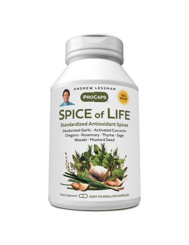 La ESPECIA de la VIDA de Andrew Lessman es más que un potente producto de ajo desodorante. Es una mezcla completamente natural de extractos y concentrados de especias poderosas que promueven la salud de todo el mundo. Durante milenios, ha sido el sabor singularmente picante de estas especias lo que las ha hecho tan valiosas. Hoy, como tantos remedios tradicionales, son sus beneficios para la salud científicamente establecidos los que alimentan nuestro interés. La Especia de la Vida ofrece ocho especias bien investigadas que proporcionan un rango integral de compuestos y beneficios protectores. La Especia de la Vida comienza con nuestro concentrado de ajo desodorante, que entrega una variedad de los compuestos basados en azufre más protectores del ajo, incluyendo alicina y alina. También incluimos nuestro extracto de cúrcuma estandarizado, que proporciona nuestro complejo de curcumina-fosfolípido activado. La cúrcuma es la especia más conocida de la India que promueve la salud, y nuestro complejo único asegura que puedas disfrutar de su larga lista de beneficios para la salud. También miramos hacia la dieta mediterránea y proporcionamos los poderosos beneficios protectores de extractos estandarizados de orégano, romero, salvia y tomillo. La Especia de la Vida ofrece extractos altamente estandarizados de las especias wasabi y semilla de mostaza, que son técnicamente miembros de la familia de vegetales crucíferos saludables. La Especia de la Vida es una extraordinaria variedad de extractos estandarizados excepcionales, seleccionados específicamente para entregar niveles precisos de los compuestos beneficiosos que buscamos en cada ingrediente.