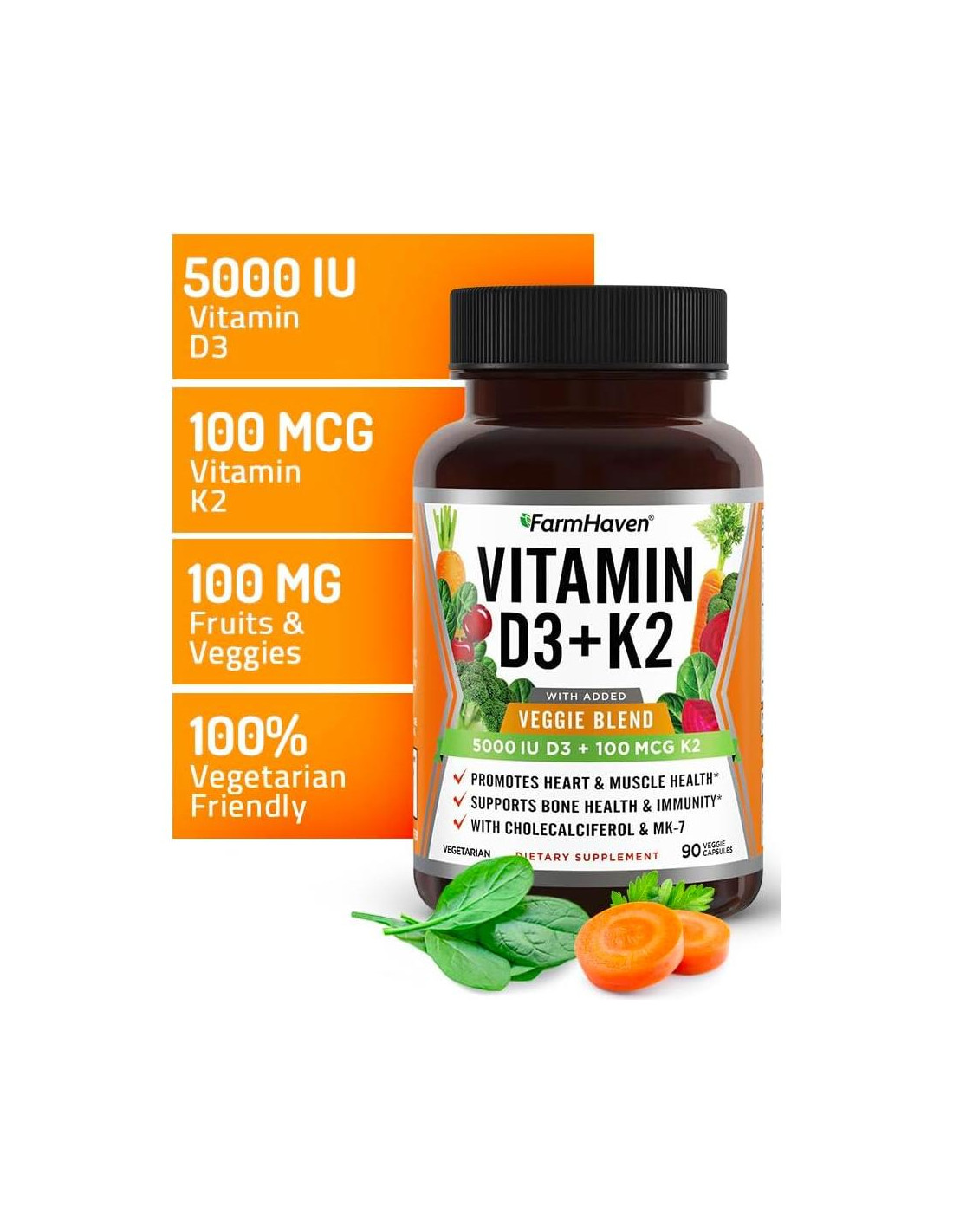 5000 UI D3 + 100 MCG K2 en una mezcla vegetal promueve la salud del corazón, los músculos mientras potencia la inmunidad.* Nuestra mezcla asegura que el calcio sea absorbido y depositado en su cuerpo donde más se necesita.* Contiene Colecalciferol y MK-7, las formas óptimas de Vitamina D y K2.* Nuestra Vitamina D3 + K2 proporciona los mejores ingredientes. Apoya la función cardiovascular y mantiene músculos fuertes y saludables. Apoya huesos saludables y potencia su sistema inmunológico para un bienestar general. Ofrece las formas más efectivas de Vitamina D3 y K2 para beneficios óptimos para la salud. Nuestros productos están elaborados con una fórmula sin gluten y no OGM para asegurar calidad y pureza. FarmHaven está dedicado a ayudar a inspirar salud y bienestar creando suplementos saludables con los mejores ingredientes posibles de la naturaleza. Estamos comprometidos a ser la marca de suplementos naturales en la que las personas pueden confiar para sí mismas y toda su familia. Nuestro equipo de investigadores revisa constantemente la ciencia y estudios más recientes para desarrollar fórmulas con ingredientes que creemos que realmente funcionan. Fabricamos nuestros productos en los EE. UU. de acuerdo con estándares estrictos. Todos los ingredientes son siempre verificados por pureza y precisión.
