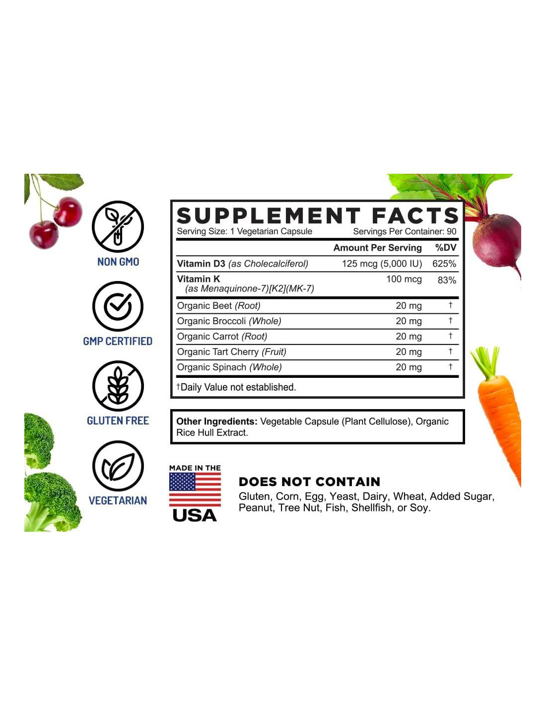 - D3 y K2 para la Absorción de Calcio: La Vitamina D3 apoya la absorción de calcio mientras que K2 ayuda a dirigir el calcio a los dientes y huesos en todo el cuerpo. Ambos trabajan juntos para huesos saludables y una absorción adecuada.*
