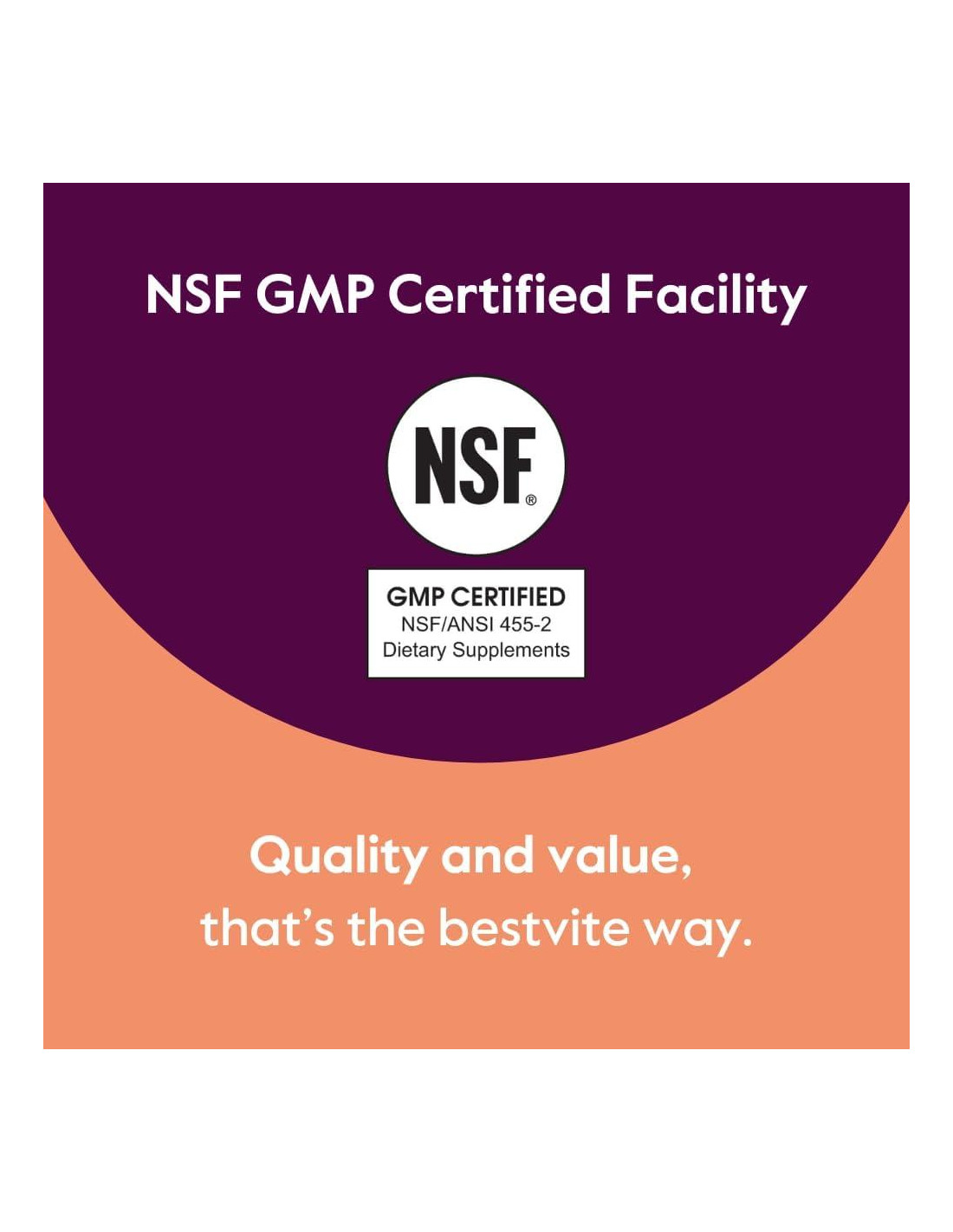 - INSTALACIÓN CERTIFICADA POR NSF GMP: La instalación de Bestvite está certificada por NSF/ANSI 455-2 Prácticas de Buenas Manufacturas (GMP) para Suplementos Dietéticos. Obtener la certificación GMP de NSF verifica que una instalación de fabricación tiene los métodos, equipos, instalaciones y controles adecuados para producir productos de suplementos dietéticos.