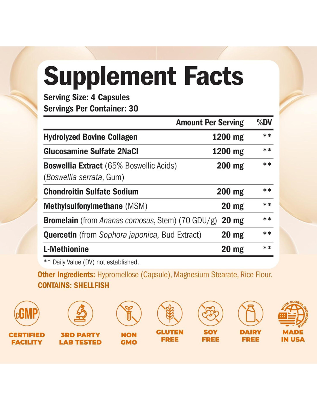 Nuestros suplementos son rigurosamente monitoreados por científicos expertos y nuestro equipo de Control de Calidad para garantizar una calidad de producto inigualable en la que puedes confiar. Realizamos pruebas de calidad exhaustivas durante la producción para asegurar la pureza y potencia de cada producto. Los ingredientes son seleccionados solo de proveedores que cumplen con Normas Industriales Estrictas y cGMP. Se realizan más pruebas de laboratorio en materias primas y productos terminados para asegurar que cada uno esté libre de bacterias dañinas. Disfruta de un estilo de vida activo con Glucosamina, Condroitina y Colágeno - el Suplemento de Soporte Articular todo en uno de Vimerson Health formulado para proporcionar Cuidado Óptimo de Articulaciones, Tendones, Huesos y Cartílago con solo 4 cápsulas convenientes al día.* Suplemento de soporte articular con 1200 mg de Glucosamina Sulfato para una salud y comodidad articular óptimas.* Con Colágeno para cabello, piel y uñas saludables. También fomenta la hidratación de la piel y el envejecimiento saludable.* Fórmula premium con Boswellia para una inflamación equilibrada y salud articular óptima.* Este Suplemento Articular de Vimerson Health se somete a estrictas pruebas de calidad para garantizar pureza y potencia. Con ingredientes obtenidos solo de proveedores que cumplen con Normas Industriales Estrictas y Buenas Prácticas de Manufactura Actuales (cGMP) - Te proporcionamos Suplementos de Colágeno y Glucosamina para Articulaciones en los que puedes confiar.* Salud Articular Multivitamínico para Hombres Multivitamínico para Mujeres Soporte Hepático Cúrcuma Jengibre Cúrcuma Quercetina