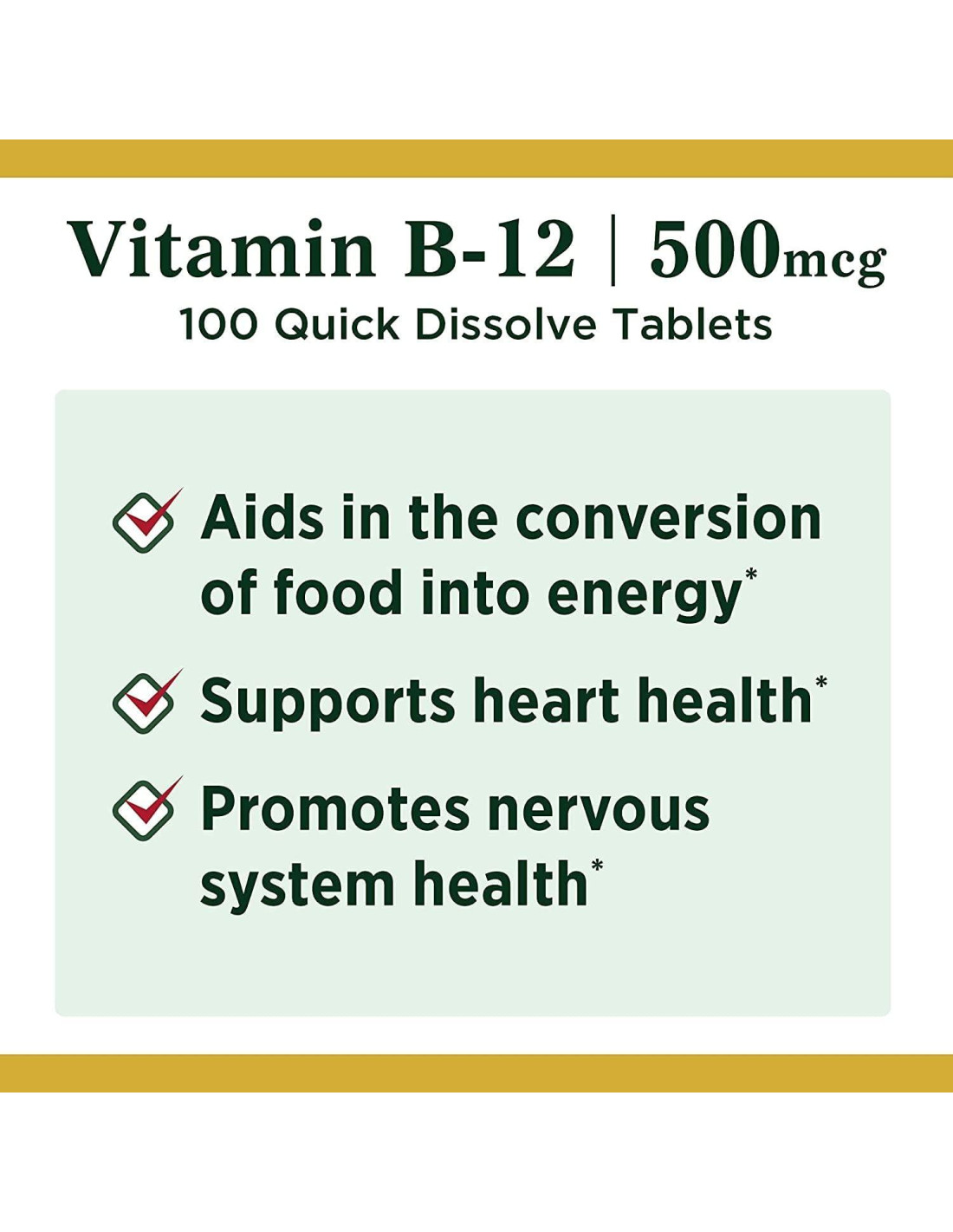 - PARA ENERGÍA Tabletas de vitamina B-12 de 100 conteos de 500mcg; Las vitaminas B-12 de disolución rápida de Nature's Bounty juegan un papel importante en el metabolismo energético en el cuerpo(1); Ayudan al cuerpo a convertir los alimentos en el combustible que se utiliza para producir energía en el cuerpo(1)