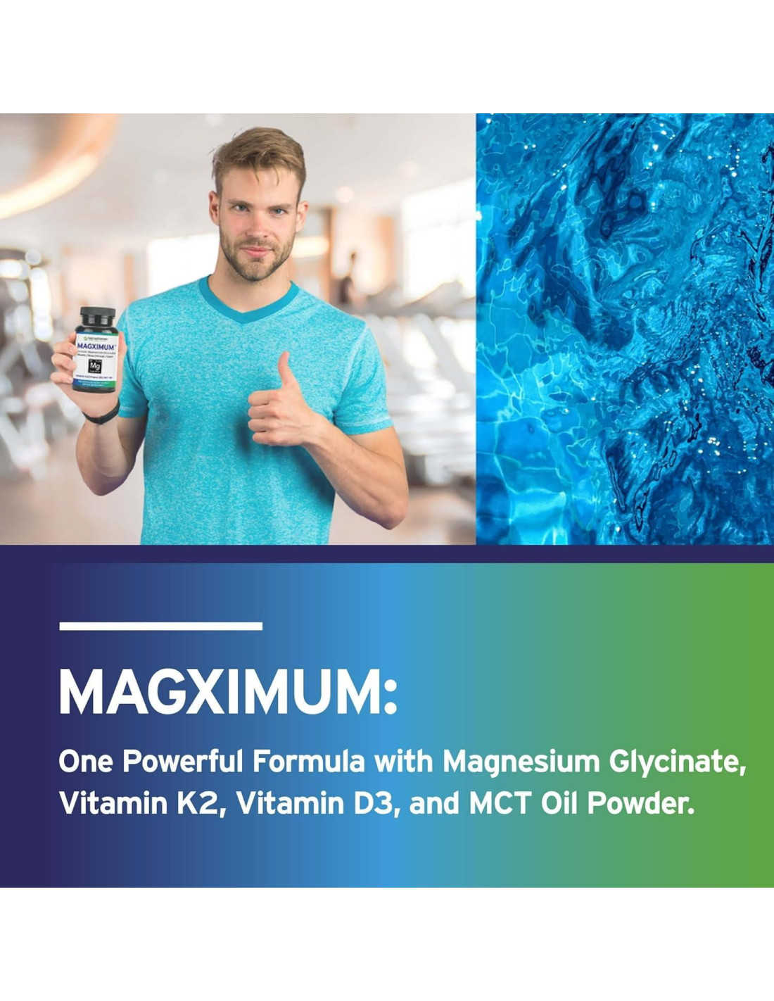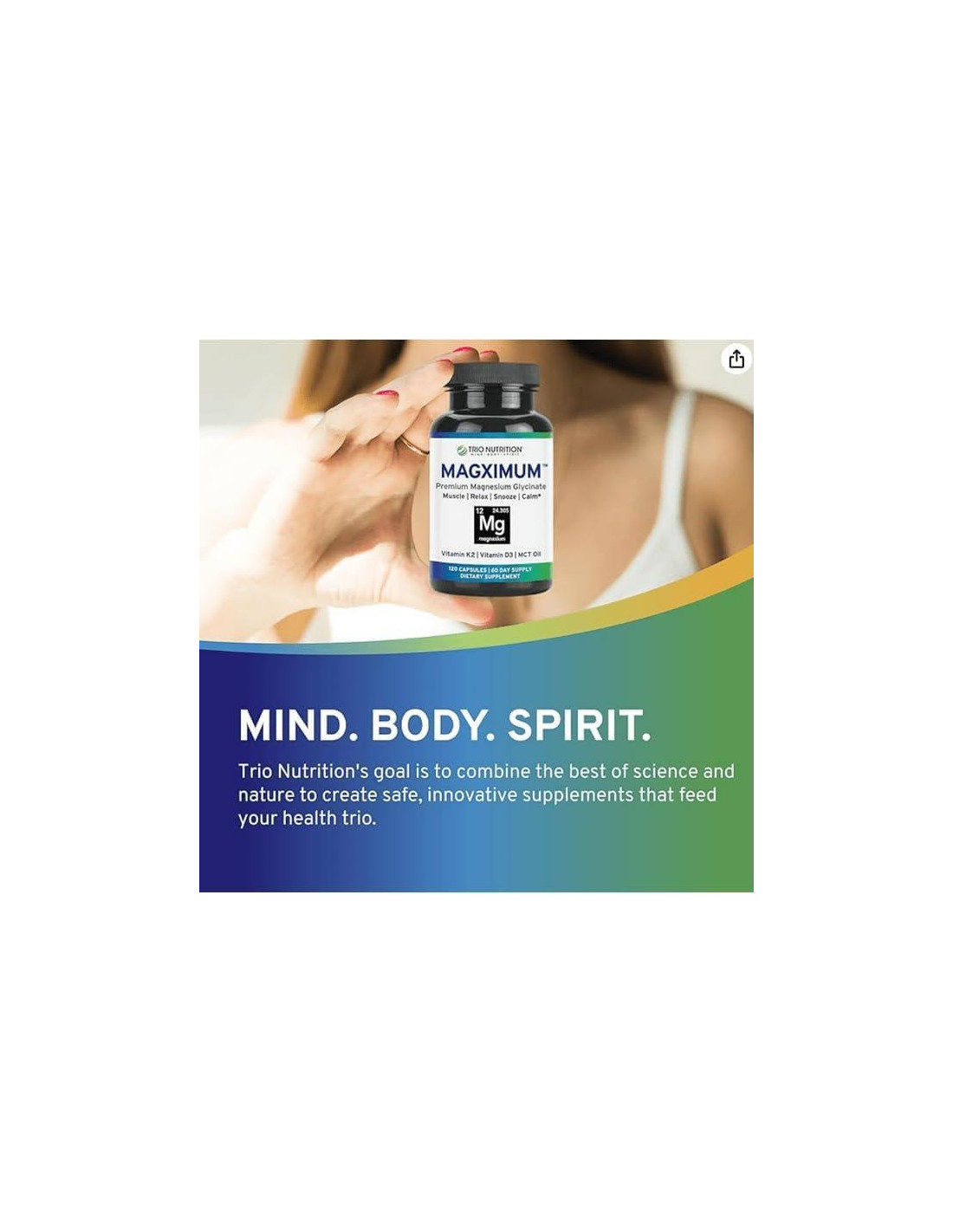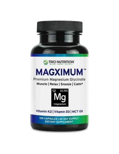 - Las cápsulas Magximum de Trio Nutrition son el primer Suplemento de Magnesio del mundo con Magnesio Glicinato, Vitamina K2, Vitamina D3 y Aceite MCT en una cápsula vegetal. Una fórmula poderosa con máxima absorción y un impacto superior. Un suministro para 60 días de magnesio quelado y tamponado al 100% en forma de Magnesio Glicinato puro.