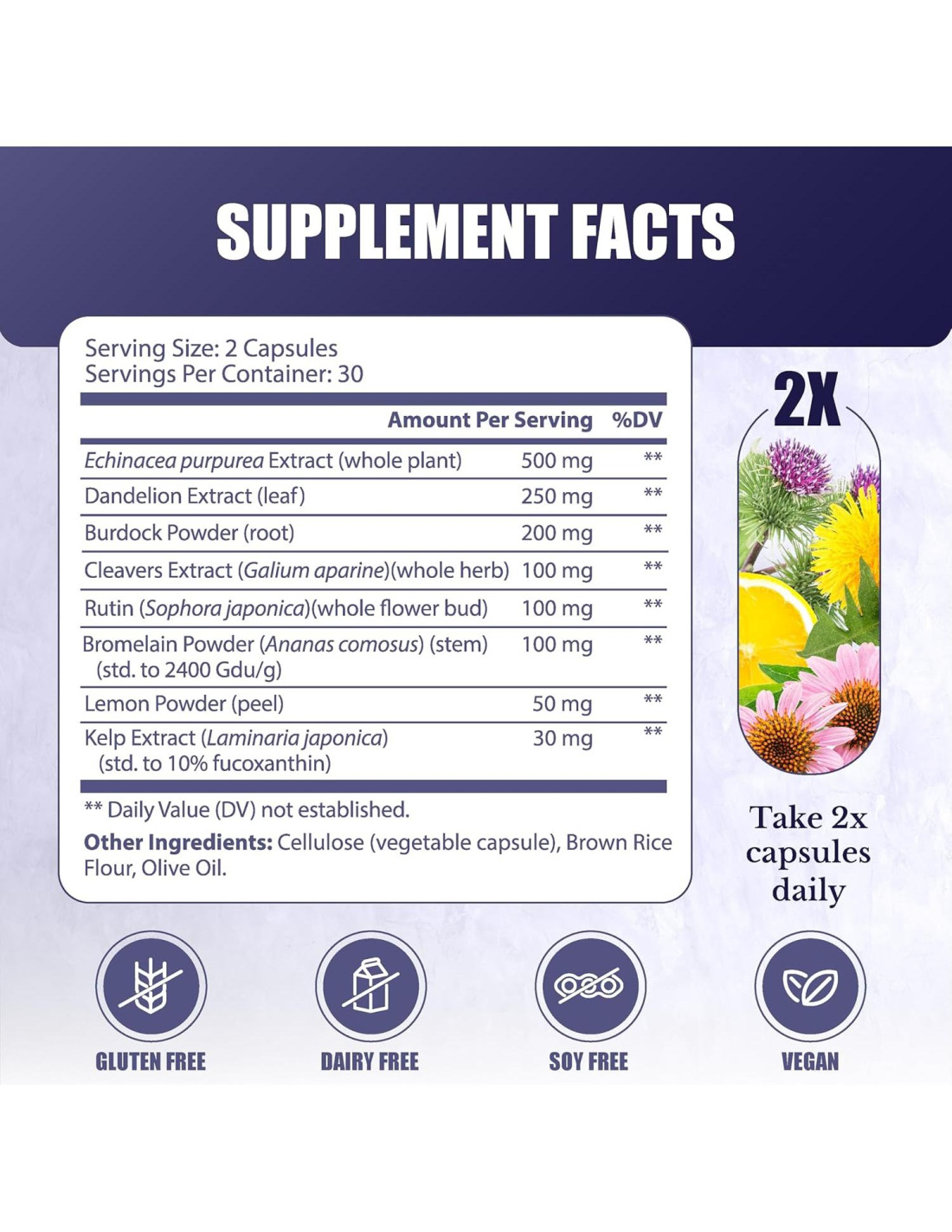 - Ingredientes de Origen Vegetal: Lymph MD presenta una combinación de Extracto de Diente de León, Polvo de Bardana, Extracto de Equinácea Purpurea, Polvo de Bromelina, Extracto de Cleavers, Polvo de Cáscara de Limón, Rutin, Alga Rica en Fucoxantina y Extracto de Raíz de Cúrcuma. Cada ingrediente se deriva de fuentes orgánicas y se selecciona en función de su uso tradicional.