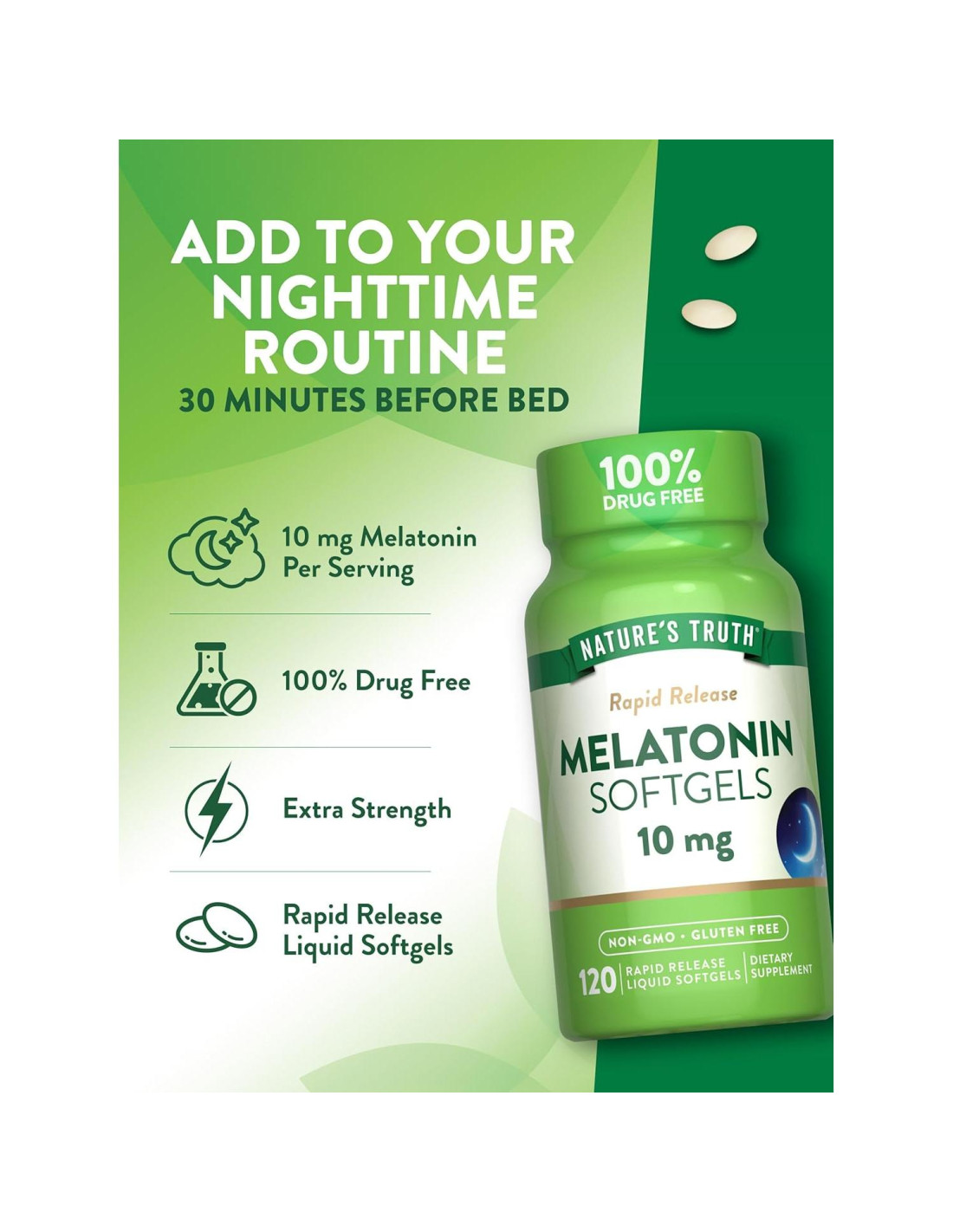 ¿Qué es la Melatonina? La melatonina es producida naturalmente por el cuerpo y trabaja en armonía con tu ciclo natural. La capacidad del cuerpo para producir esta hormona que ocurre naturalmente puede comenzar a disminuir con la edad, por lo que puedes apoyarla con un suplemento de melatonina de confianza. Las cápsulas blandas de liberación rápida de melatonina de la Verdad de la Naturaleza Cada porción de nuestras cápsulas blandas de melatonina proporciona 10 mg de melatonina. Nuestra fórmula utiliza tecnología de entrega avanzada con cápsulas blandas líquidas de liberación rápida. Agrega fácilmente a tu rutina nocturna, con solo una cápsula blanda 30 minutos antes de acostarte. La Verdad de la Naturaleza: Donde Comienza el Bienestar Nuestra misión en la Verdad de la Naturaleza es satisfacer tus necesidades de bienestar con productos que van más allá. La Verdad de la Naturaleza proporciona suplementos en varias formas de entrega, como cápsulas, cápsulas blandas, masticables, tabletas, polvos, líquidos y gomitas para adaptarse a cada preferencia. Nuestra cápsula blanda de melatonina de liberación rápida es sin OGM y libre de gluten, trigo, levadura, leche, lactosa, sabor artificial, edulcorante artificial y conservantes.