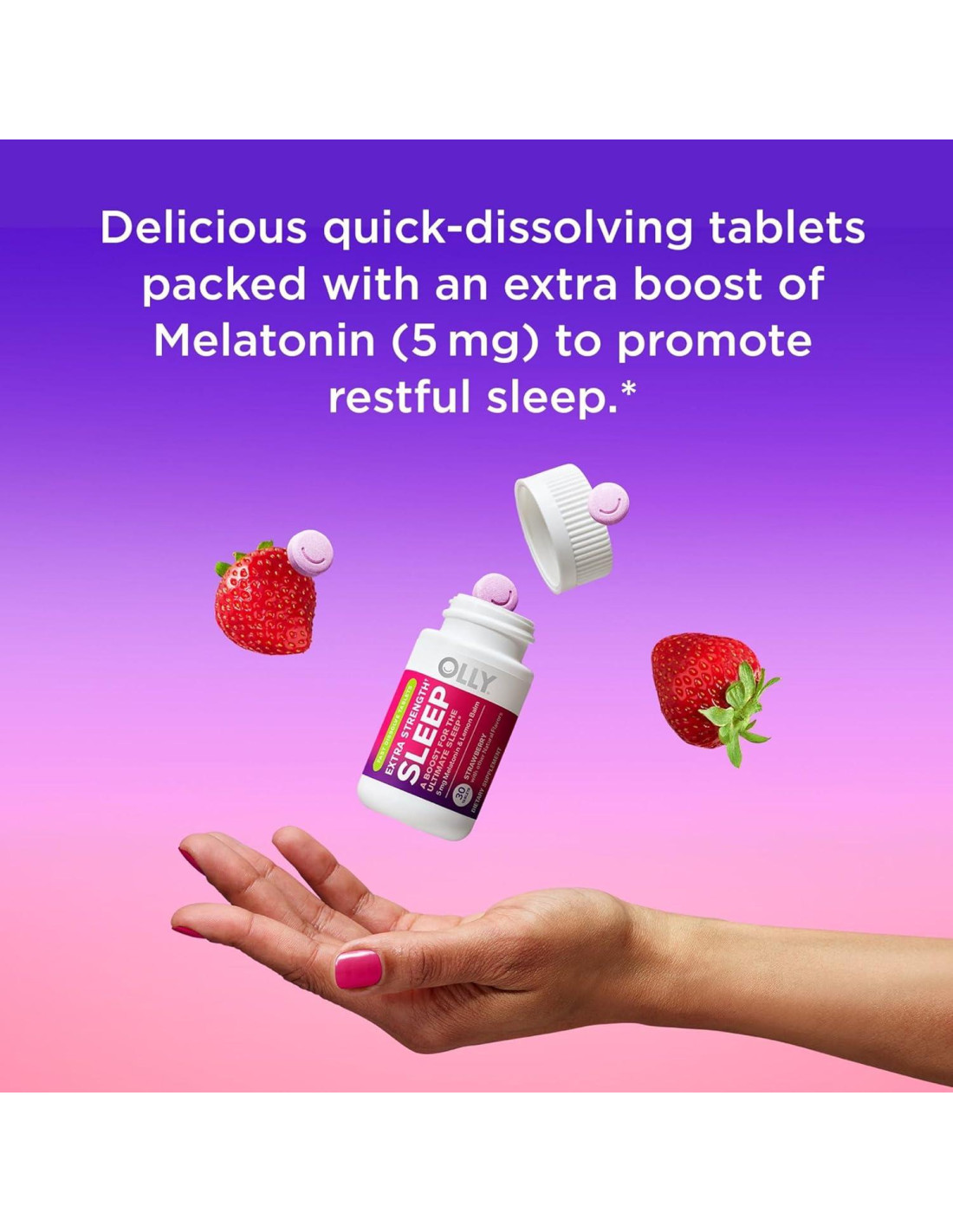 ¡Buscadores de sueño, regocíjense! Estas deliciosas tabletas de ayuda para dormir de disolución rápida están llenas de un impulso extra de 5 mg de Melatonina que ayuda a promover un sueño reparador. Simplemente pon una en tu boca y disfruta de la bondad con sabor a fresa. No crean hábito y son 100% libres de drogas. ¿No suena soñador? Las Tabletas de Sueño Extra Fuerte de OLLY están hechas con una mezcla experta de Melatonina y Melisa. La Melatonina trabaja con tu cuerpo para ayudarte a quedarte dormido y permanecer dormido; la Melisa es una planta que se ha utilizado durante siglos. Son libres de azúcar, veganas y hechas sin colores sintéticos. Adultos, tomen una 30 minutos antes de acostarse para disfrutar de un sueño reparador. En OLLY, creamos vitaminas y suplementos deliciosos con beneficios reales que te ayudan a vivir Feliz por Dentro y por Fuera. Estas declaraciones no han sido evaluadas por la Administración de Alimentos y Medicamentos. Este producto no está destinado a diagnosticar, tratar, curar o prevenir ninguna enfermedad.