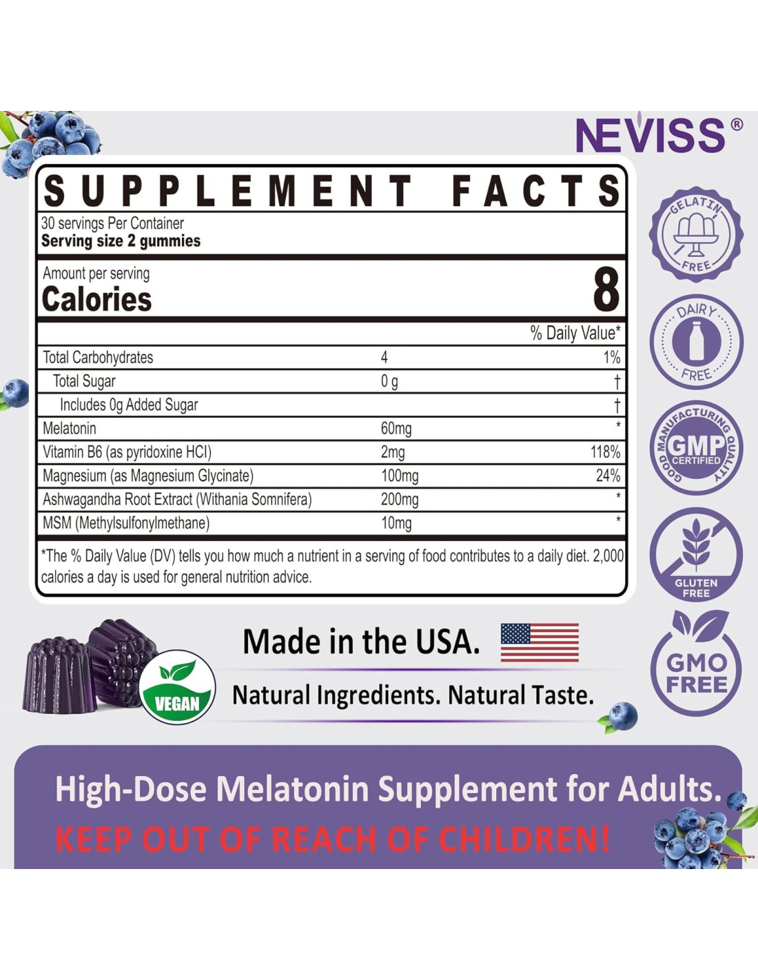 - Diseñado para Adultos de 50+: Nuestras gominolas de Melatonina de 60mg están elaboradas expertamente para adultos de 50 años o más. Mejoradas con Vitamina B6 y MSM, esta sofisticada mezcla apoya los beneficios antienvejecimiento, la claridad cognitiva y la vitalidad general, promoviendo un sentido equilibrado de bienestar que aborda las necesidades únicas de los adultos mayores.