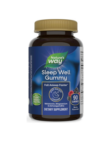 Obtén el sueño de calidad que necesitas con las gomitas Sleep Well de Nature's Way. Esta fórmula única con melatonina, ashwagandha y magnesio ayuda a relajar la mente y el cuerpo y apoya un sueño reparador. El ashwagandha Sensoril ha demostrado reducir el estrés percibido con el uso continuo, y el magnesio apoya la relajación muscular. La melatonina no adictiva te ayuda a conciliar el sueño más rápido. Las gomitas también contienen una excelente fuente de magnesio por cada porción de 2 gomitas. Esta declaración no ha sido evaluada por la Administración de Alimentos y Medicamentos. Este producto no está destinado a diagnosticar, tratar, curar o prevenir ninguna enfermedad.