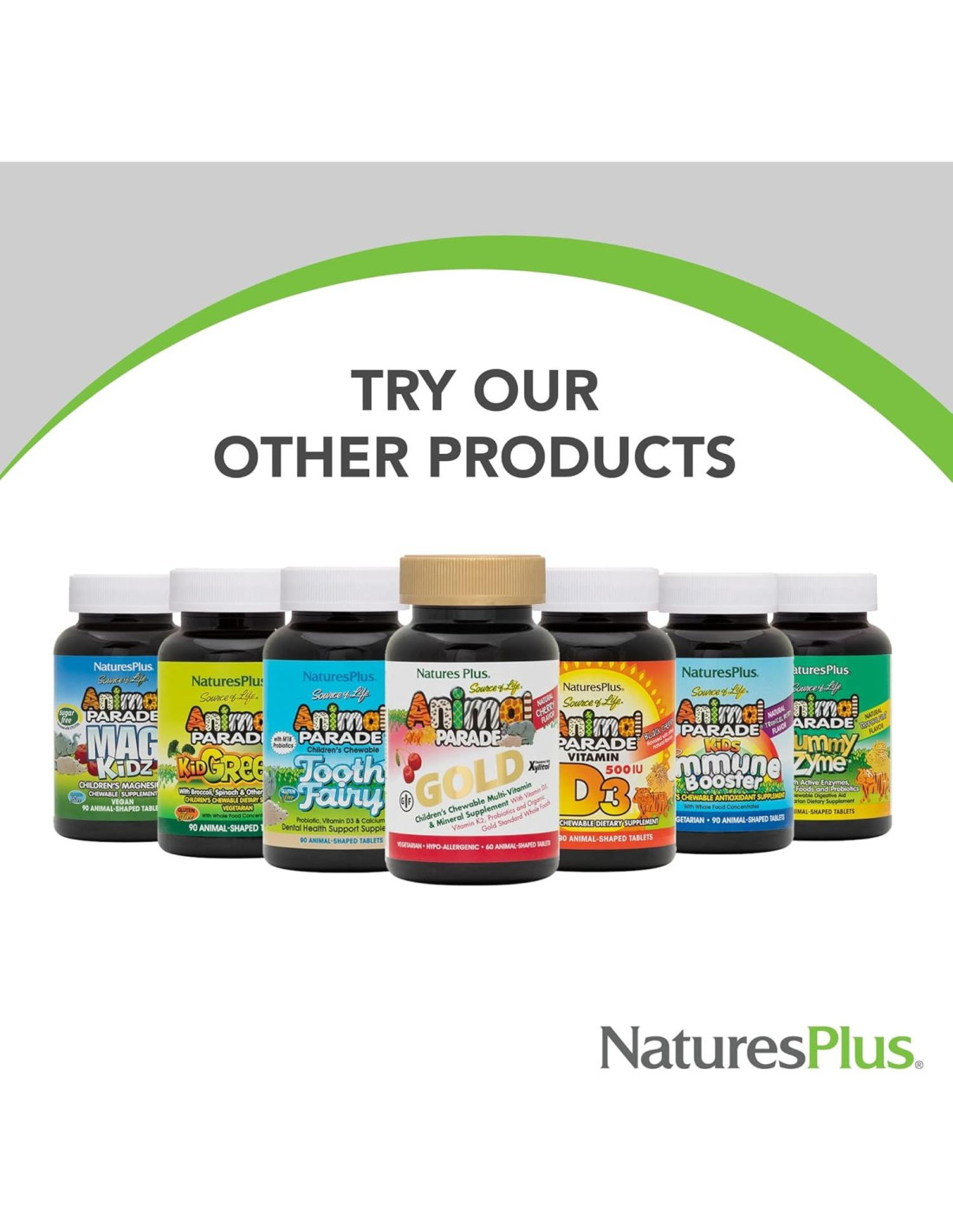 Nuestras tabletas masticables vienen en divertidas formas de animales y deliciosos sabores, por lo que a los niños realmente les encantará obtener sus vitaminas y minerales diarios. Nos esforzamos por ofrecer a los consumidores suplementos inteligentes y de alta calidad basados en investigaciones sólidas y altos estándares de formulación. Por eso, cada botella de NaturesPlus dice: 'Fabricado con AMOR.' Es solo nuestra manera de asegurar que nuestros productos cumplirán con la calidad que esperas. Animal Parade está especialmente diseñado para satisfacer las necesidades nutricionales de los niños. Nuestras tabletas contienen los alimentos integrales, vitaminas y minerales necesarios para apoyar la salud inmunológica y ósea en los niños.* *Estas declaraciones no han sido evaluadas por la Administración de Alimentos y Medicamentos. Este producto no está destinado a diagnosticar, tratar, curar o prevenir ninguna enfermedad.