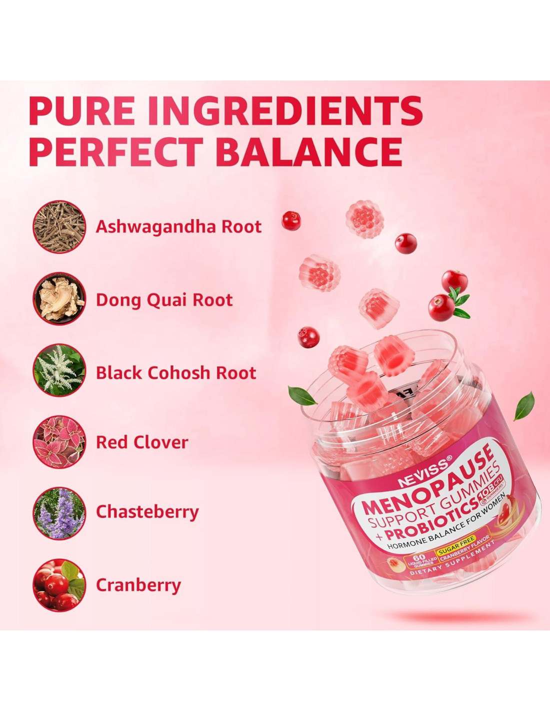 - Suplemento de Soporte para la Menopausia Nuestras gominolas de menopausia están formuladas con un complejo herbal natural que incluye ashwagandha, cohosh negro, dong quai, trébol rojo, bayas de saúco, arándano y vitaminas de menopausia B6, D3 y E, que pueden enfriar efectivamente los sofocos de las mujeres, despedirse fácilmente de los sudores nocturnos y cambios de humor, y mejorar la calidad del sueño.