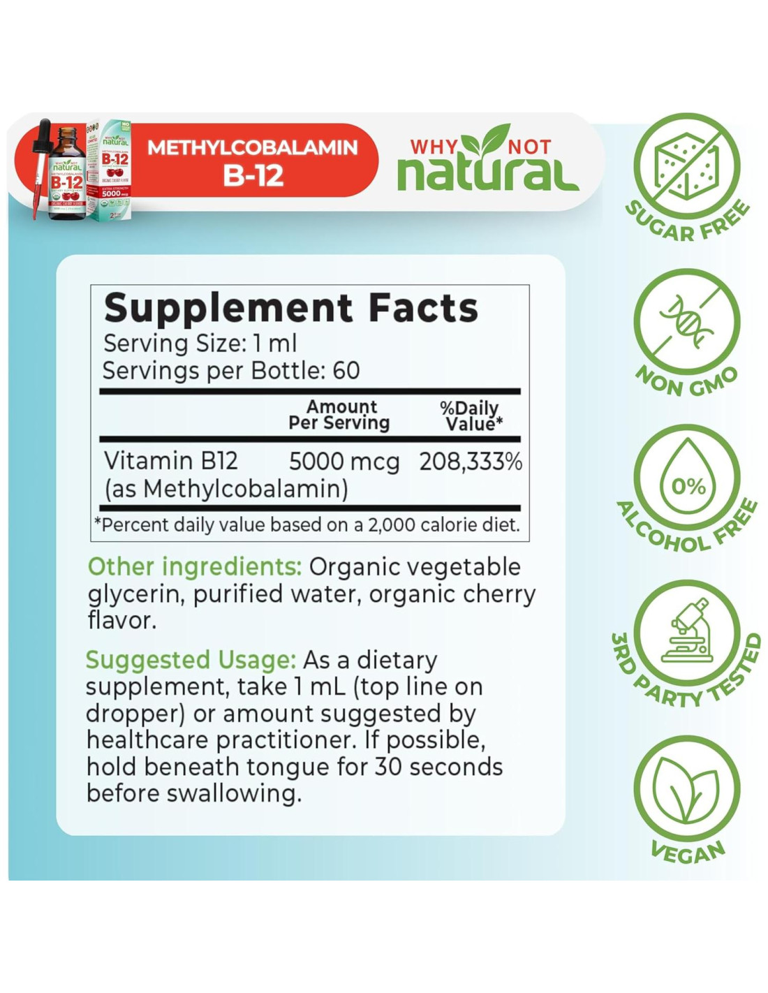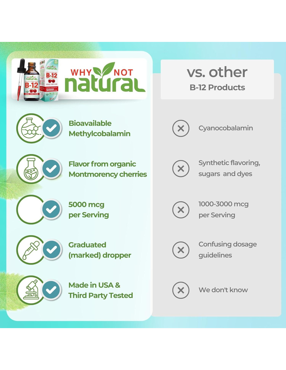 - COMPARA NUESTRA CALIDAD: Compara la etiqueta de hechos de tu actual suplemento de B12 con nuestra vitamina B12 líquida, y ve por qué Why Not Natural B12 es el #1. Hemos hecho de nuestra misión crear las mejores gotas de B12.