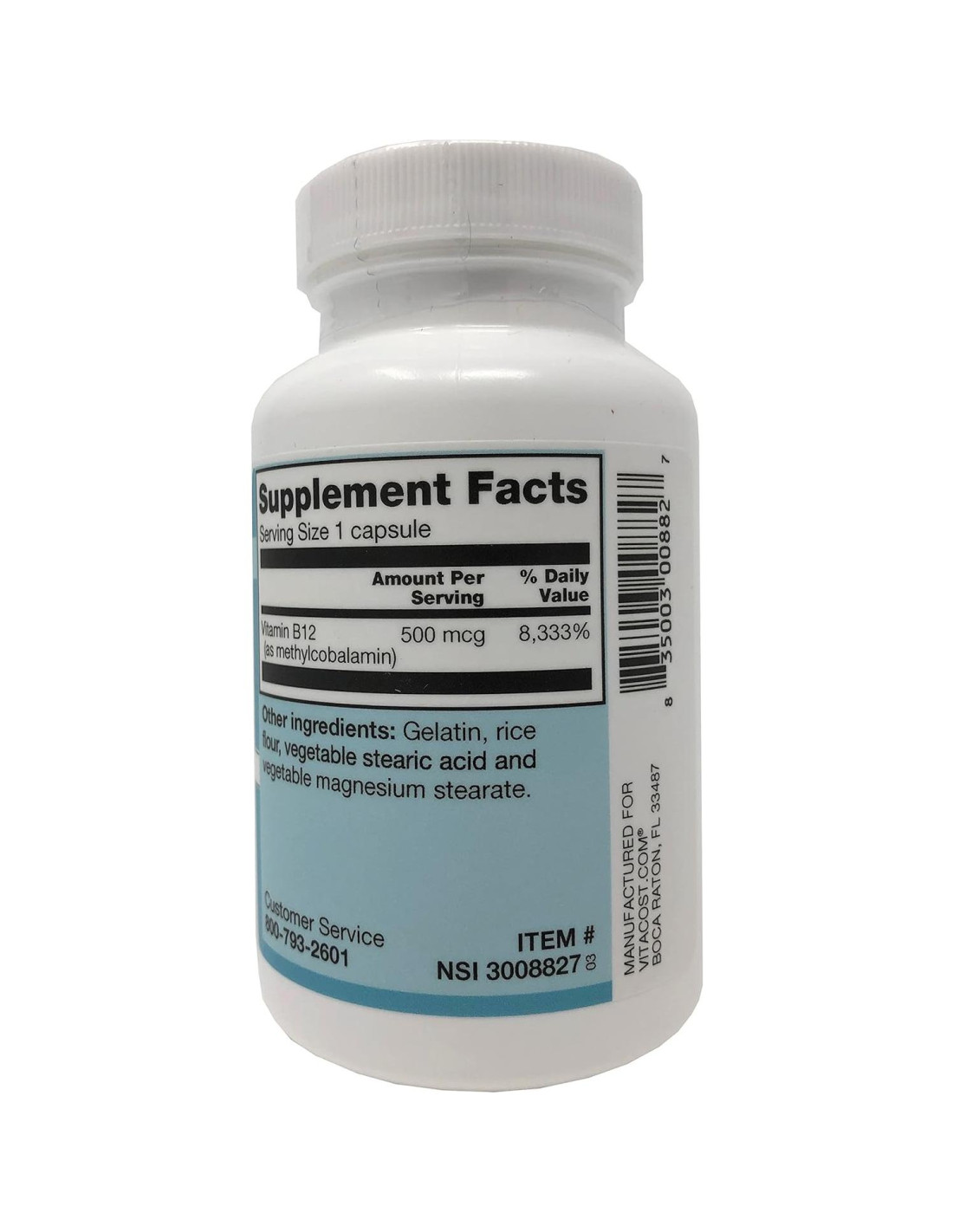- Proporciona 500 mcg de vitamina B-12 por porción de una cápsula. Contiene 300 porciones por botella.