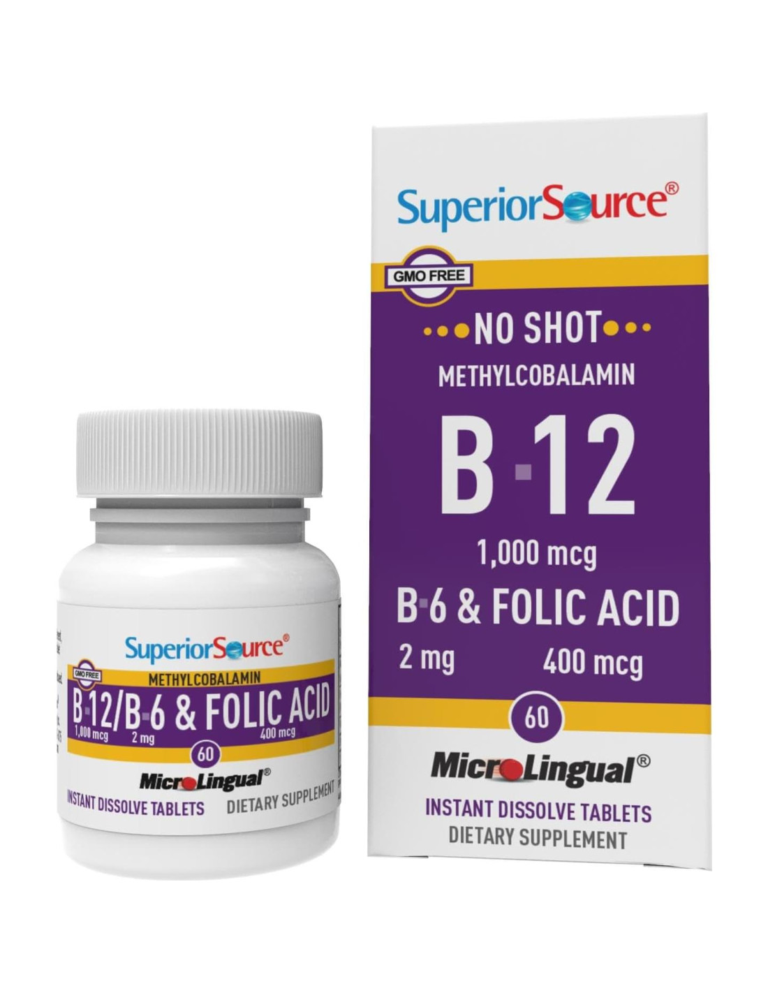 - Complejo de Vitamina B: Las tabletas Superior Source No Shot B-12, B-6 y Ácido Fólico apoyan la producción celular, la salud cerebral y el metabolismo energético