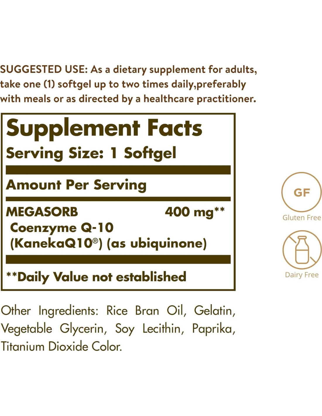 - Sin Gluten, Trigo y Lácteos; Solgar Megasorb CoQ-10 es libre de: gluten, trigo, lácteos, levadura, azúcar, sodio, sabor artificial y edulcorante