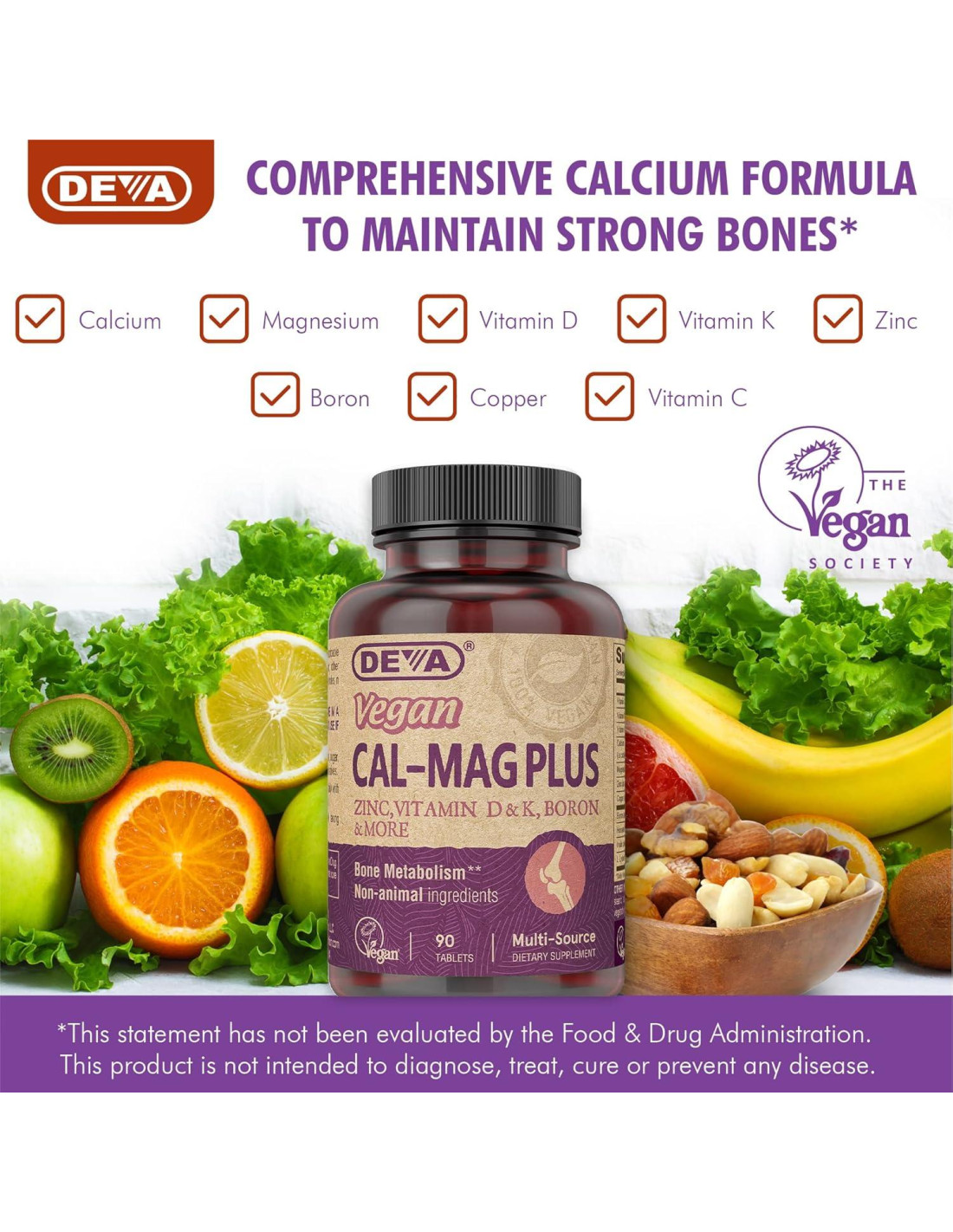 - CERTIFICADO VEGANO: El suplemento Cal-Mag Plus de DEVA es 100% libre de animales y certificado vegano por la Vegan Society. Nuestras vitaminas y suplementos veganos están garantizados por pureza, frescura y potencia etiquetada.
