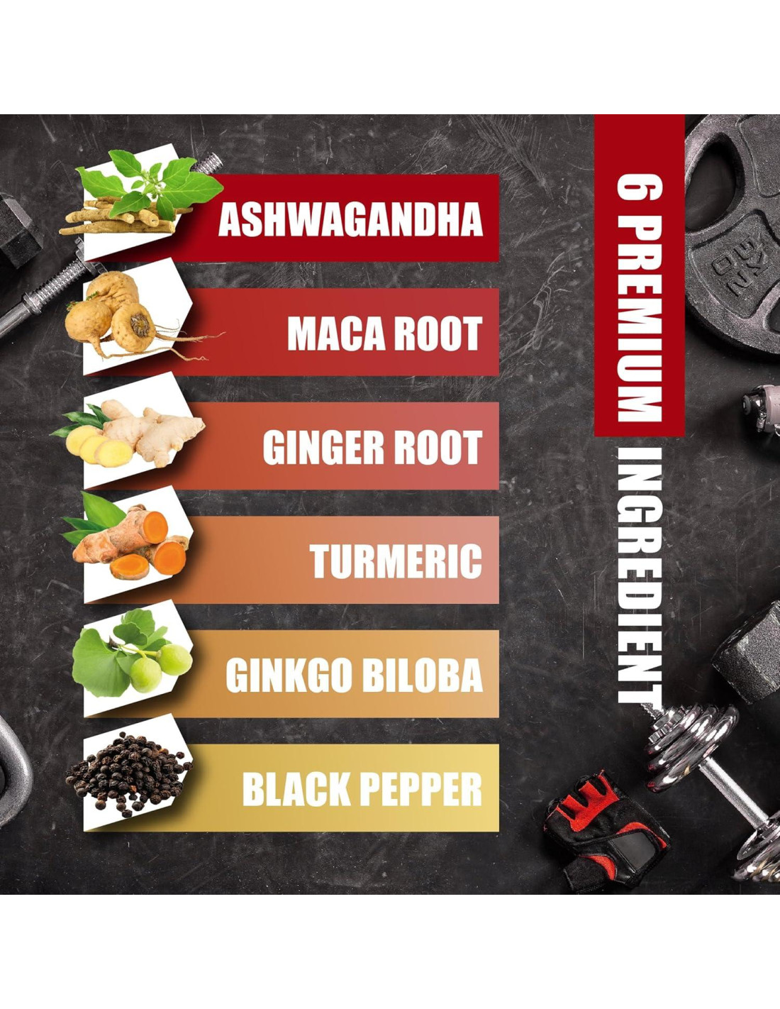 - Ingredientes: Ashwagandha, Raíz de Maca, Cúrcuma Curcumina, Jengibre, Ginkgo Biloba, Pimienta Negra.