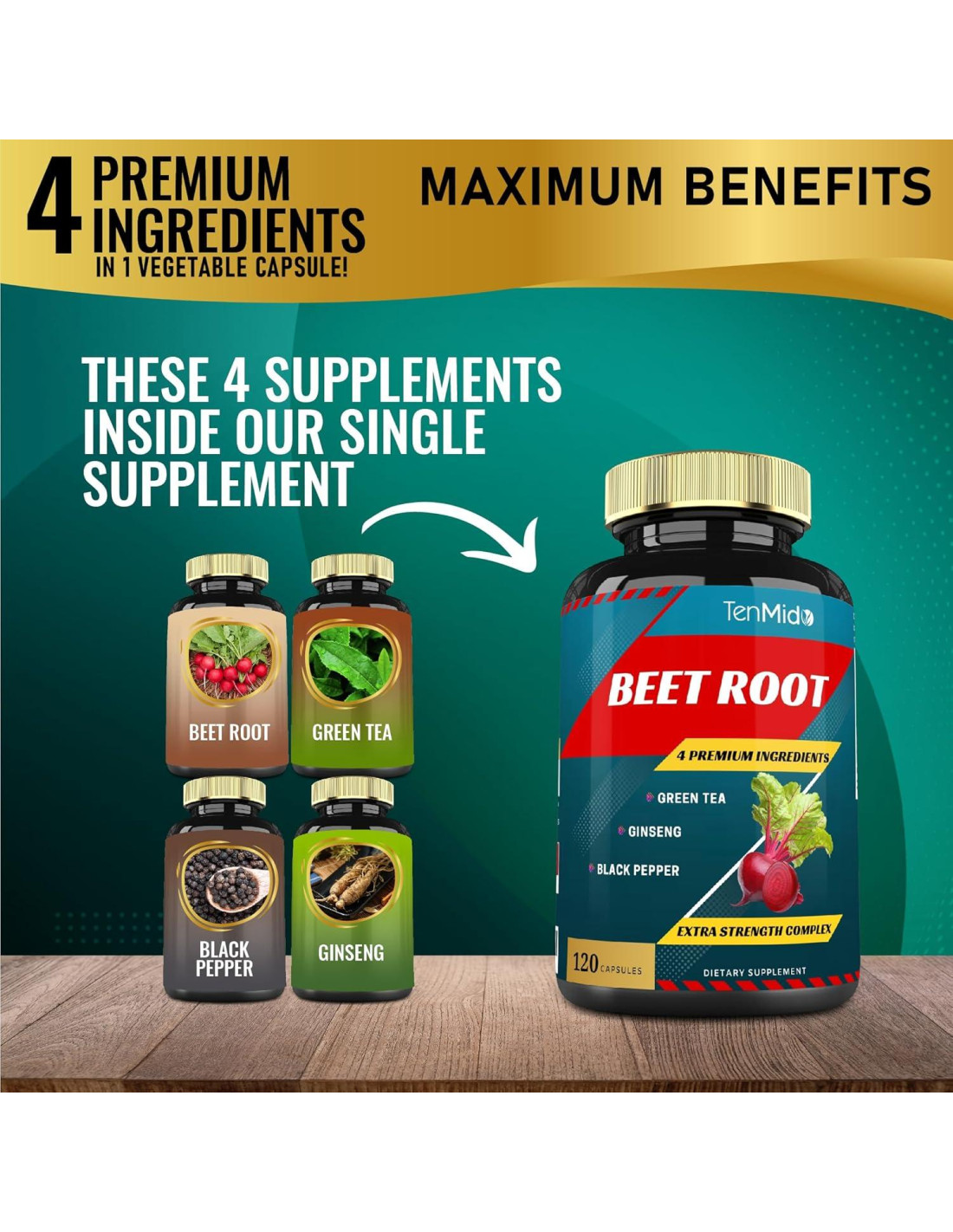 - Fórmula Premium: Las cápsulas de extracto de remolacha Tenmido combinan 3 ingredientes herbales problemáticos extra poderosos: Té Verde, Ginseng, Pimienta Negra. Con la fórmula optimizada especial, nuestro producto ha demostrado ser una de las hierbas más ventajosas, con la mayor absorción y biodisponibilidad para tu salud en general.