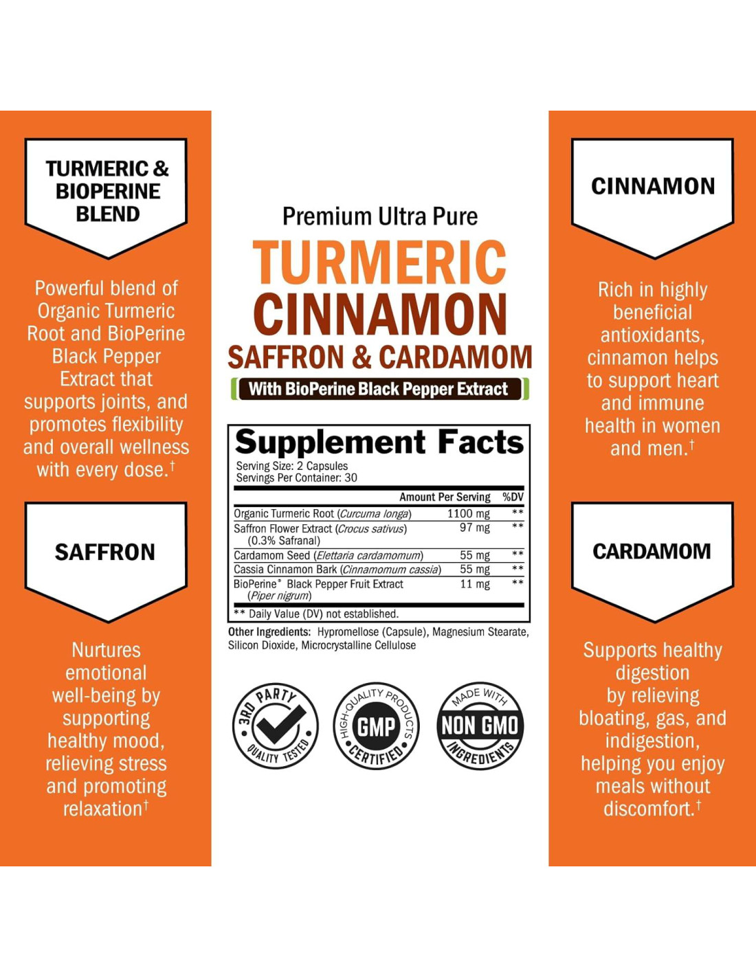 - Suministro de 30 Días: Disfrute de un mes completo de apoyo diario con su botella de nuestro Cúrcuma Canela Azafrán y Cardamomo