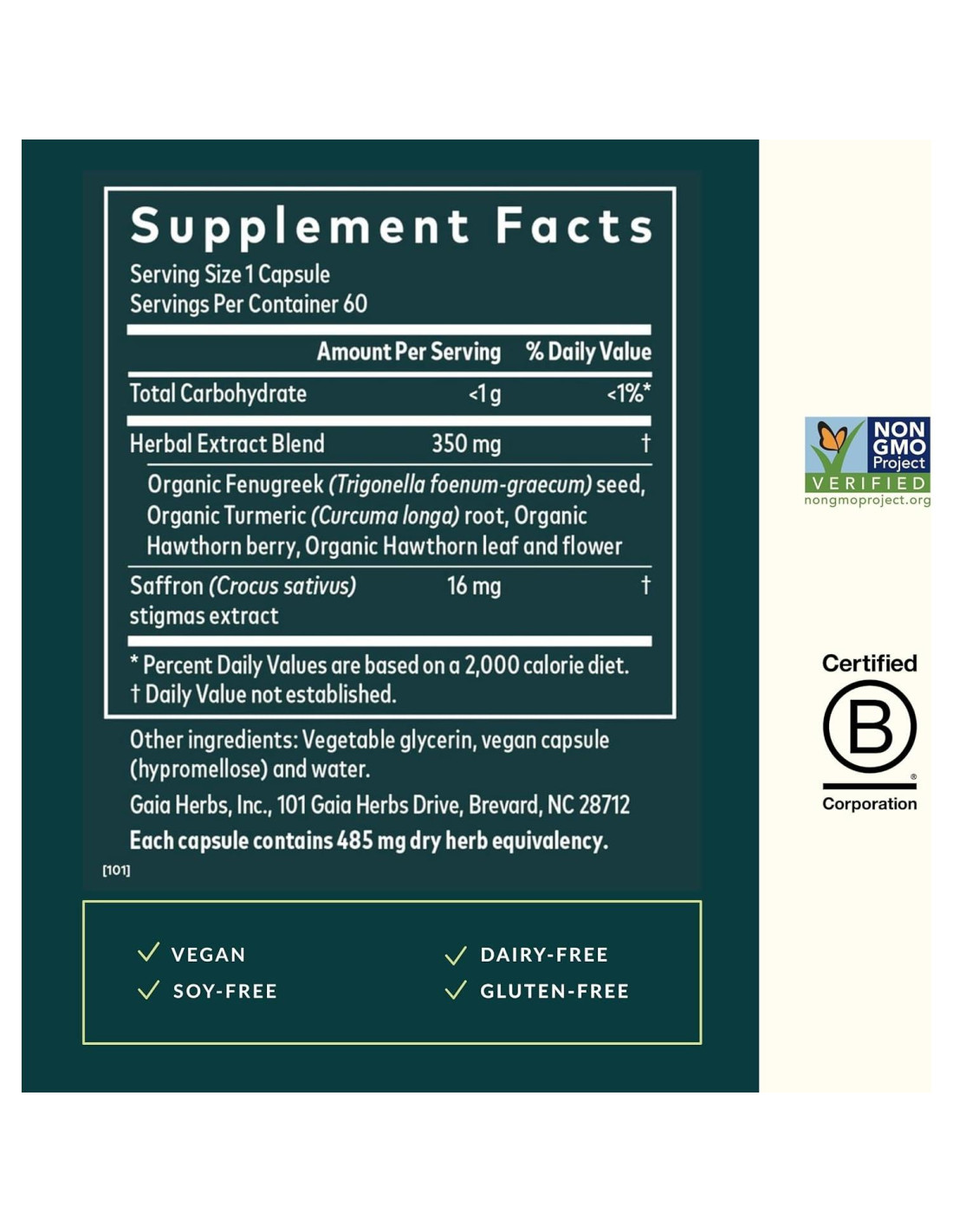 - Ingredientes Premium: Este suplemento herbal contiene azafrán orgánico, cúrcuma, fenogreco y espino para un apoyo natural