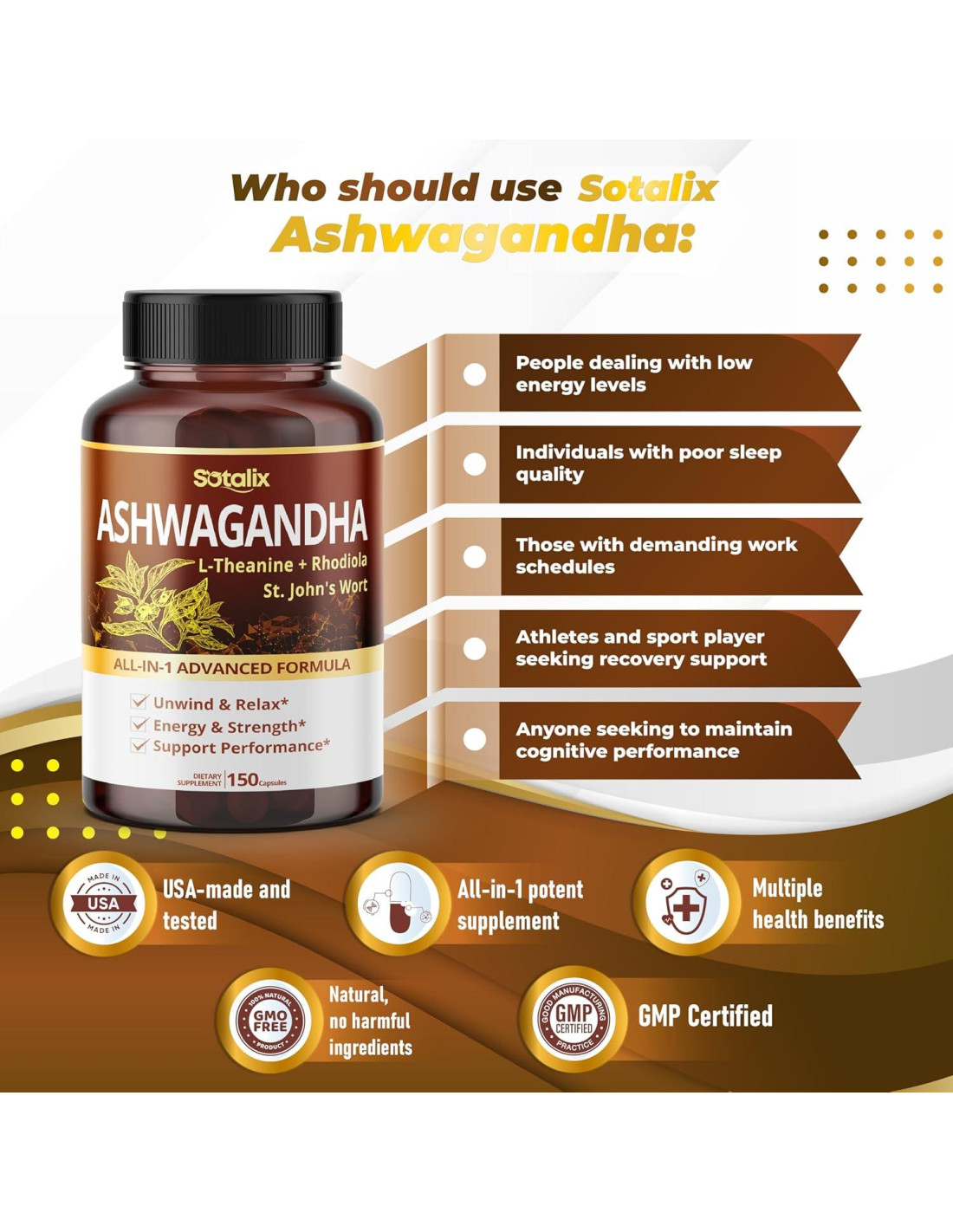 - A diferencia de los suplementos típicos de Ashwagandha, el producto Sotalix cuenta con una impresionante concentración de Ashwagandha, junto con una notable cantidad de Hierba de San Juan y Rhodiola Rosea.