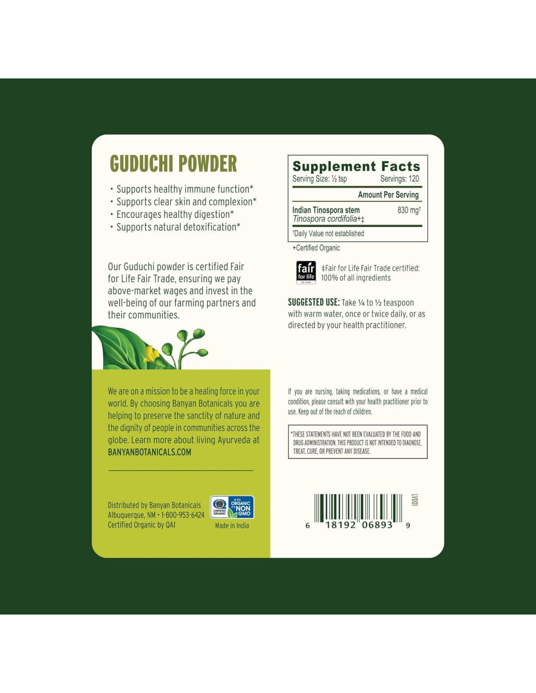- ESTE POLVO DE guduchi DE ALTA CALIDAD se puede usar para hacer un té de salud inmunológica orgánico, o tomarse como un suplemento de digestión orgánico o suplemento de piel orgánico. Simplemente mezcla con agua tibia, miel o ghee.